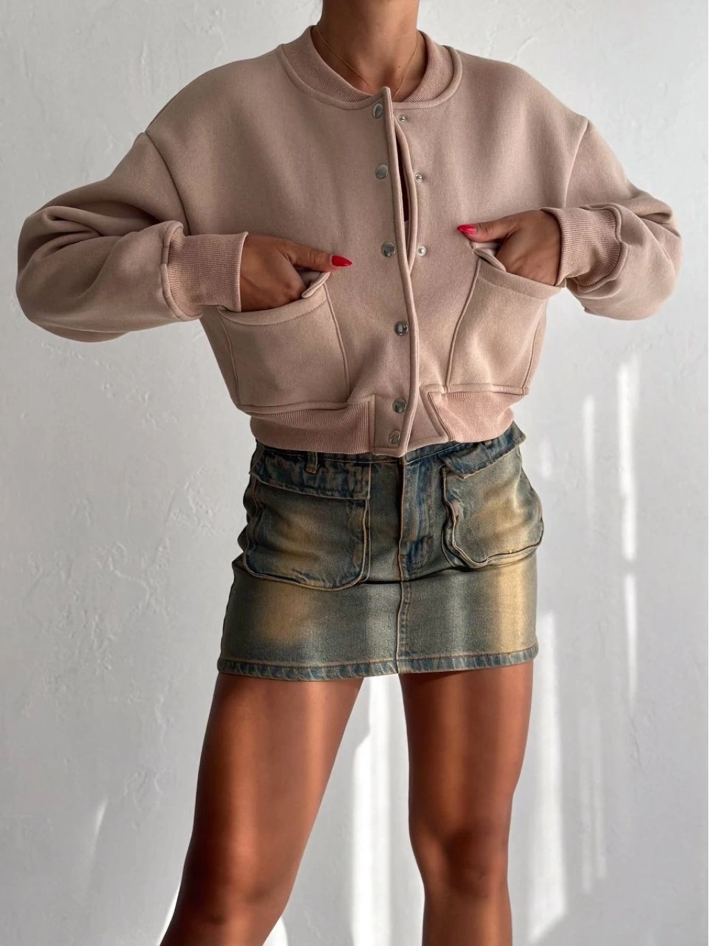 3 iplik şardonlu Önü çıtçıtlı cepli ceket bej f2226