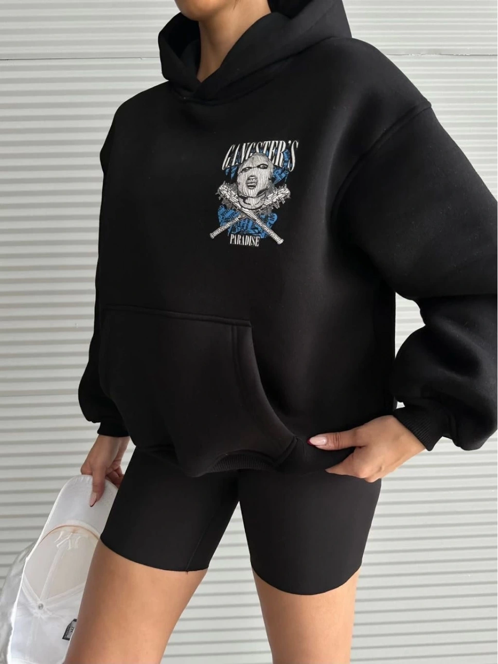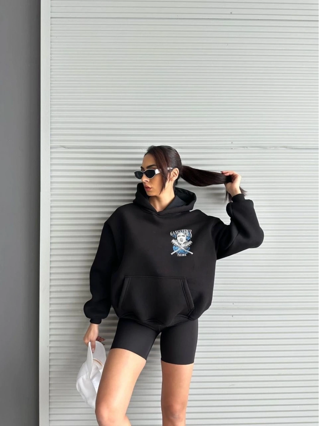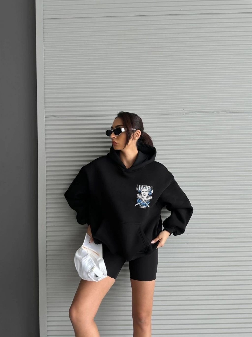 3 iplik şardonlu oversize kafa baskılı sweat siyah