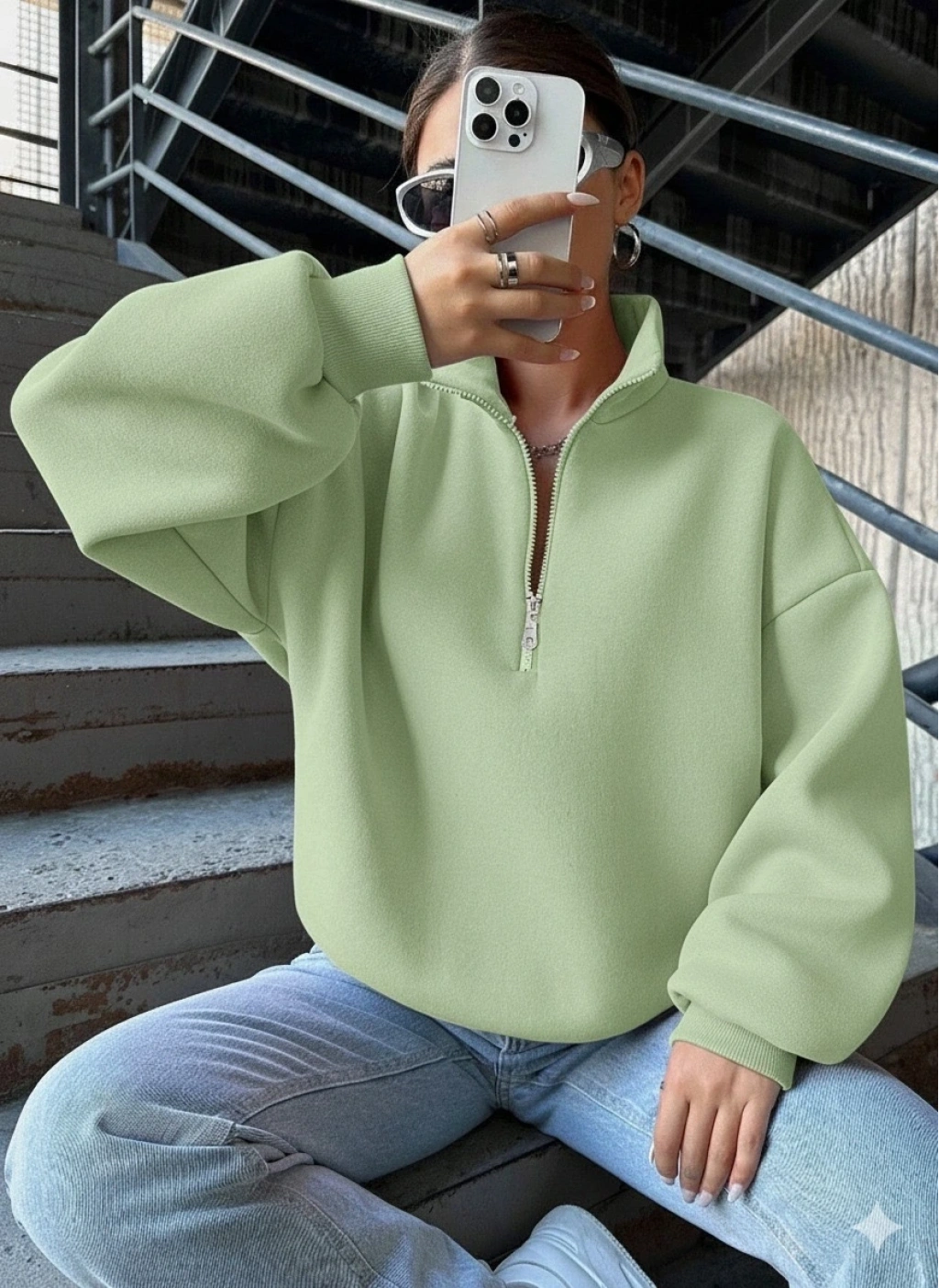 yüksek kaliteli 3 iplik Şardonlu Yarım Fermuarlı Sweatshirt Mint modeli, şıklığı ve rahatlığı bir araya getiriyor. İnce detayları ve modern görünümü ile öne çıkan bu sweatshirt, şıklığı seven kadınların gardırobunda mutlaka olması gereken bir parça.