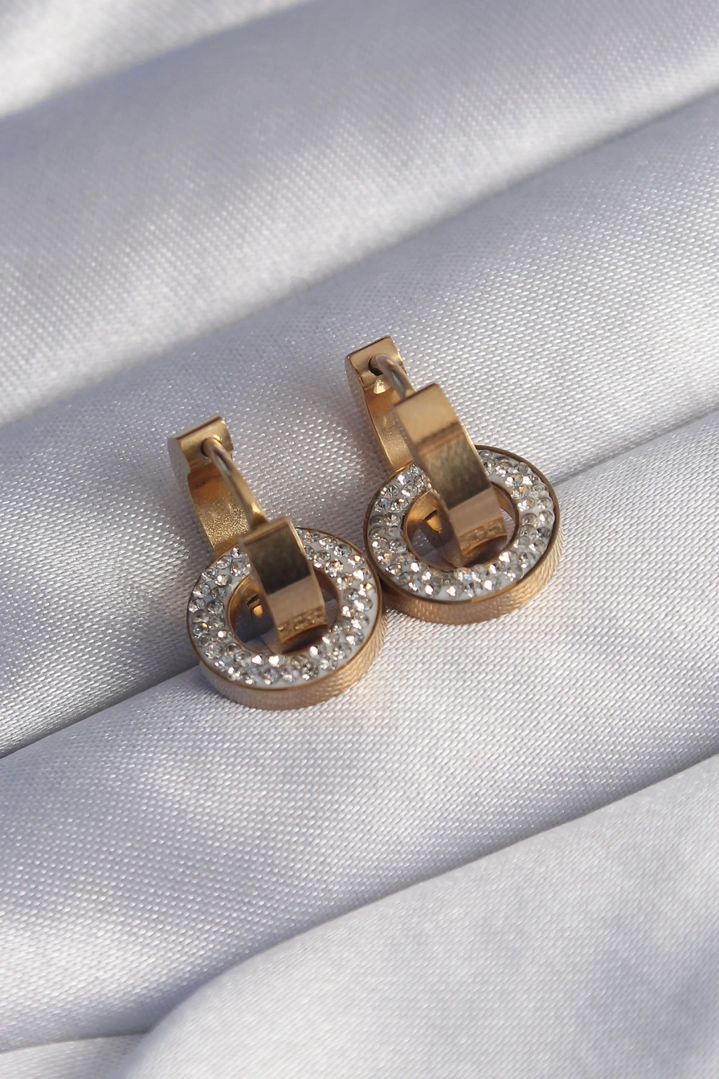 316L Çelik Gold Renk Zirkon Taşlı İç İçe Geçmeli Oval Küpe