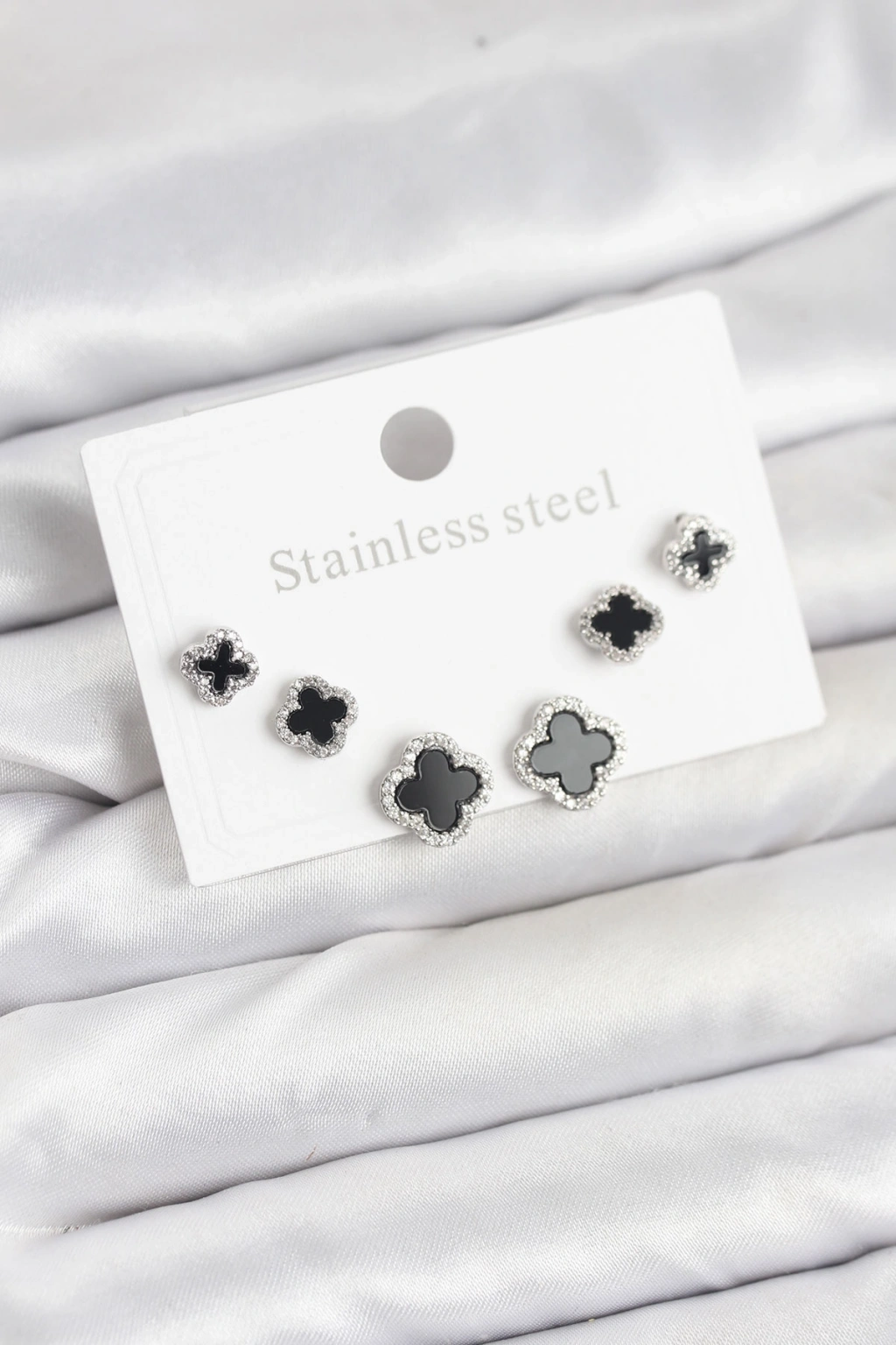 316L Çelik Gümüş Renk Zirkon Taşlı Yonca Model Kadın Küpe Seti