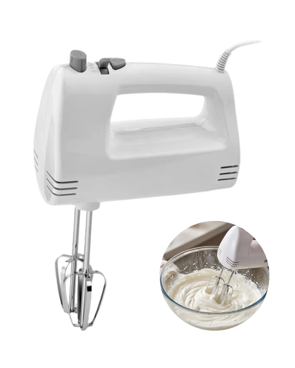 Mutfakta pratik ve hızlı hazırlık yapmak isteyen kullanıcılar için tasarlanmış olan el mikseri, güçlü motoru ve kullanışlı tasarımı sayesinde günlük mutfak işlerini kolaylaştırır.250W gücündeki motor sistemi sayesinde kek hamuru, krema ve sos gibi birçok karışım kısa sürede hazırlanabilir.5 kademe hız ayarı sayesinde farklı tariflere uygun hız seçenekleri sunar.Paslanmaz çelik çırpma aparatları dayanıklı yapısı sayesinde uzun süreli kullanım sağlar.Aksesuar çıkarma düğmesi aparatların kolay şekilde çıkarılmasını sağlar ve temizlik işlemini kolaylaştırır.Ergonomik tasarımı sayesinde elde rahat bir kullanım sunar.