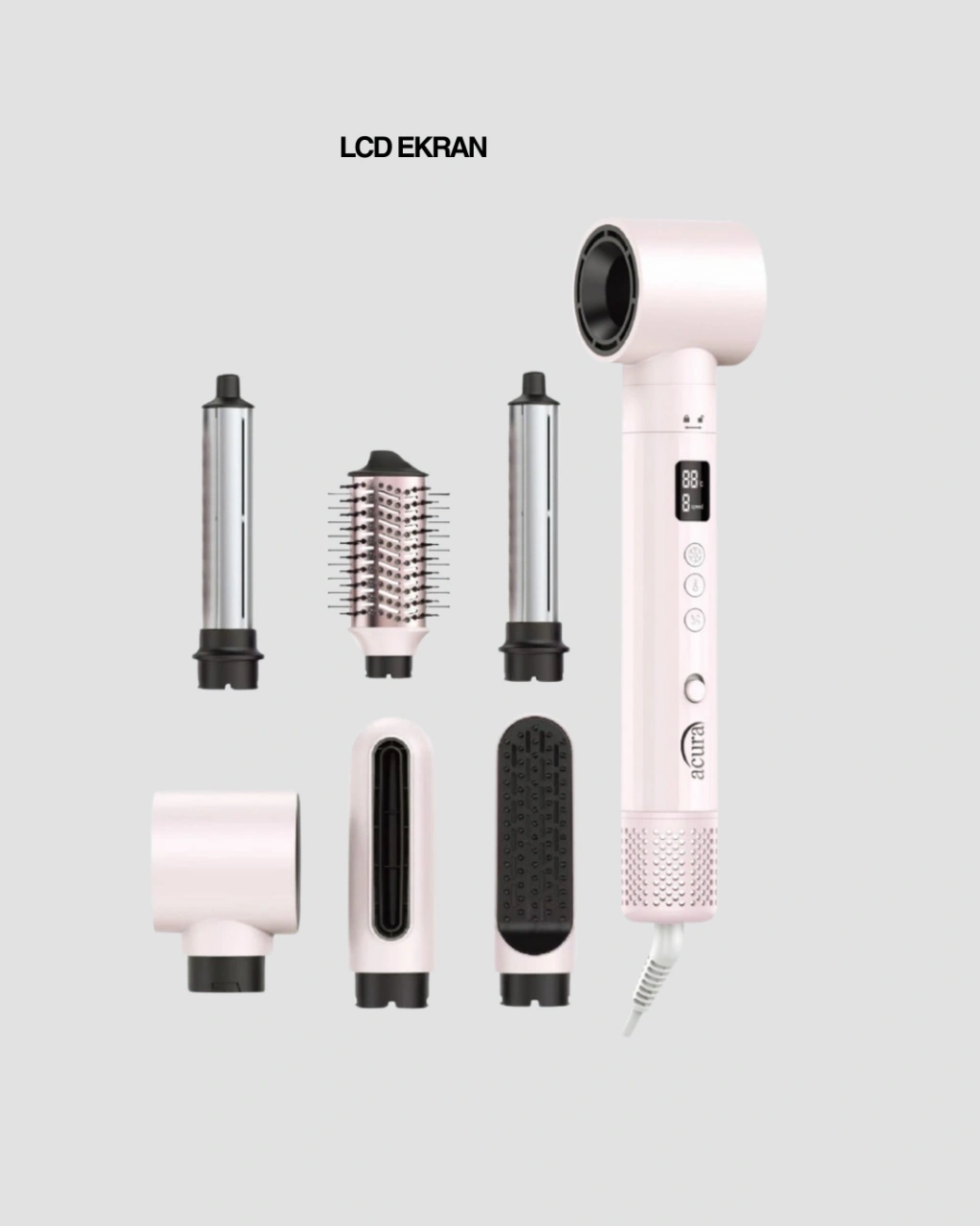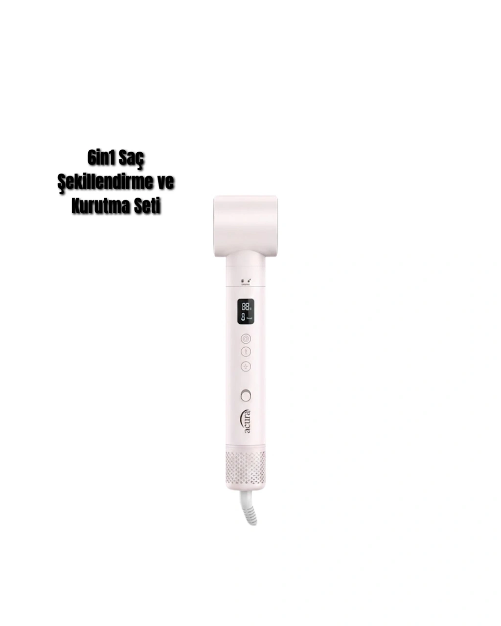 Acura AC-95 Airstyle 6-in-1 Saç Şekillendirme Seti, evde profesyonel saç bakım ve şekillendirme deneyimi yaşamak isteyenler için tasarlanmıştır. Yüksek performanslı motoru, akıllı ısı yönetimi ve çoklu başlıkları ile saç bakımını zahmetsiz hale getirir.110.000 rpm motor hızı, güçlü hava akışı sunarak saçların hızlı ve etkili şekilde kurumasını sağlar. Negatif iyon teknolojisi, saç tellerinin nemini koruyarak daha sağlıklı ve parlak bir görünüm kazandırır. Elektriklenmeyi azaltır ve saçın daha pürüzsüz görünmesine yardımcı olur.LCD ekranlı kontrol paneli, sıcaklık ve hız ayarlarını net şekilde görmenizi sağlar. 3 kademeli sıcaklık ve hız ayarı ile saç tipinize uygun kişisel ayarlamalar yapabilirsiniz. Akıllı sıcaklık kontrol sistemi, saçın aşırı ısınmasını önler.Set içeriğinde bulunan farklı başlıklar, farklı saç stilleri oluşturmanıza olanak tanır. Bukle başlıkları, hacimlendirici fırça ve düzleştirme fırçası ile çok yönlü kullanım sunar. Soğuk üfleme özelliği, şekli sabitleyerek kalıcı sonuçlar elde etmenizi sağlar.Hafif ve ergonomik tasarımı, uzun süreli kullanımda konfor sağlar. 2 yıl garanti güvencesiyle sunulan Acura AC-95 Airstyle, saç bakımına önem veren kullanıcılar için güvenilir ve etkili bir tercihtir.