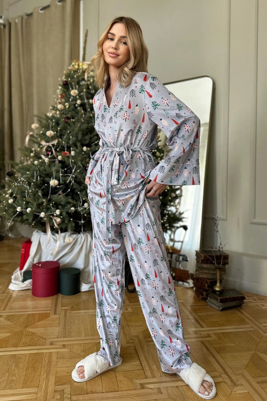 Açık Gri Zemin Çam Ağaçları Kadife İkili Takım – Sıcaklık ve Doğal Zarafetin Buluşması