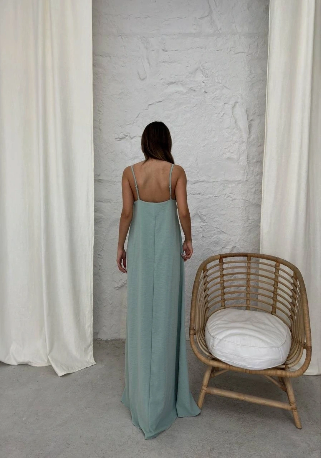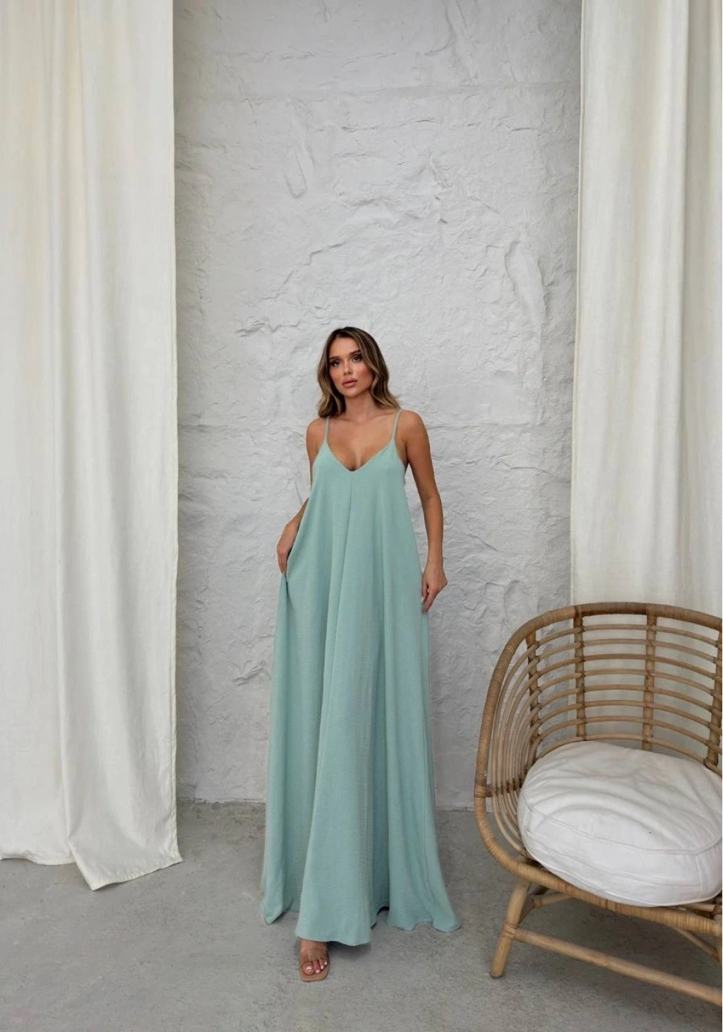 Aerobin uzun elbise, şıklığı ve rahatlığı bir arada sunan çağla yeşili rengi ile dikkat çekiyor.