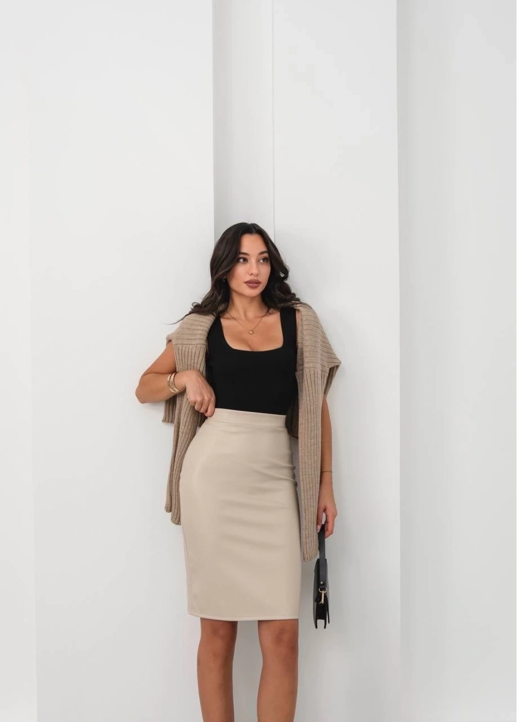 Arkadan yırtmaçlı kalem etek bej, şıklığı ve zarafeti bir arada sunar. Hem günlük kullanıma uygun hem de özel davetlerde tercih edilebilecek bir parçadır.