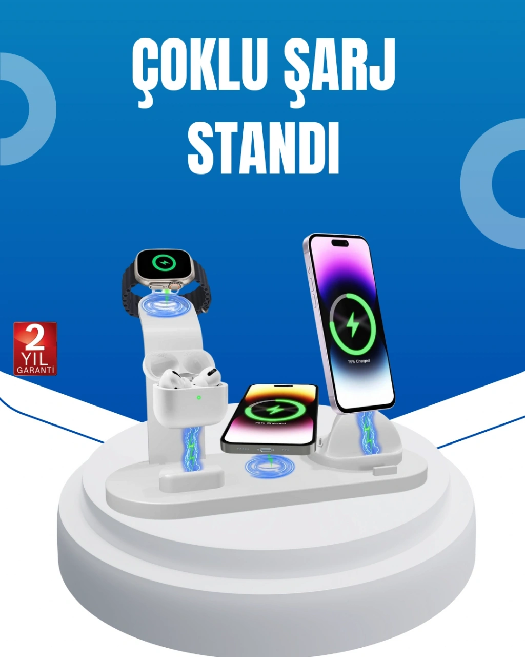 Kablo karmaşasına son veren bu 4’ü 1 arada şarj standı, aynı anda telefon, akıllı saat ve kulaklıklarınızı şarj edebilme özelliğine sahiptir. 15W hızlı şarj gücü, cihazlarınıza hızlı enerji sağlar. Güvenlik sistemleriyle donatılmış olup aşırı şarj ve aşırı ısınmayı önler. Şık ve modern tasarımı, masaüstünüze düzenli bir görünüm kazandırır. Evde, iş yerinde veya seyahatlerde rahatlıkla kullanılabilir. Dayanıklı malzemeleri sayesinde uzun süreli kullanım için idealdir.