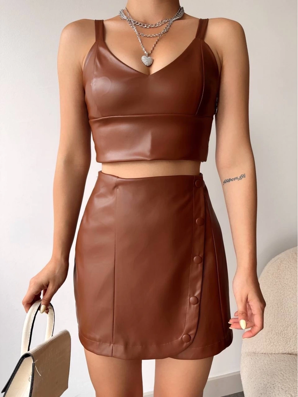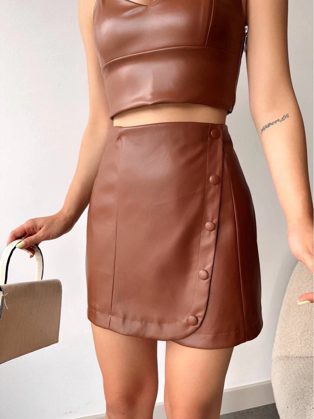 Günlük kullanımdan özel davetlere kadar birçok farklı kombinle rahatlıkla tamamlanabilen Beş düğmeli oval deri eteği, topuklu ayakkabılarla veya sneaker'larla kombinleyerek farklı tarzlara kolayca adapte edebilirsiniz.