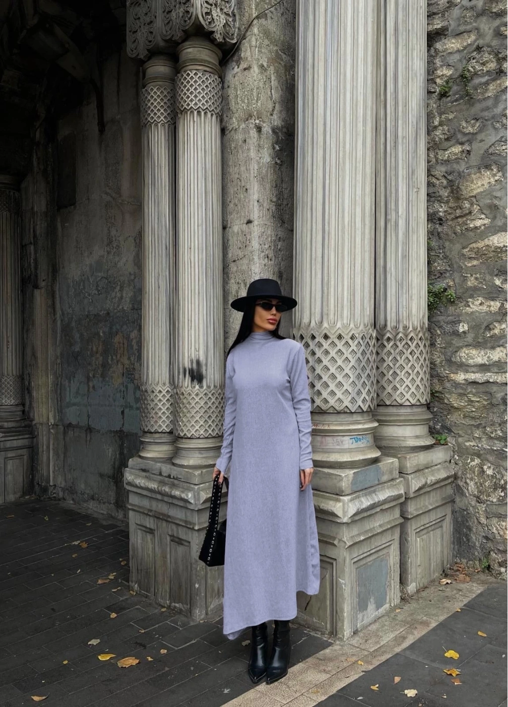 Boğazlı kalın bürümcük uzun elbise gri, hem şık hem de rahat bir seçenektir.