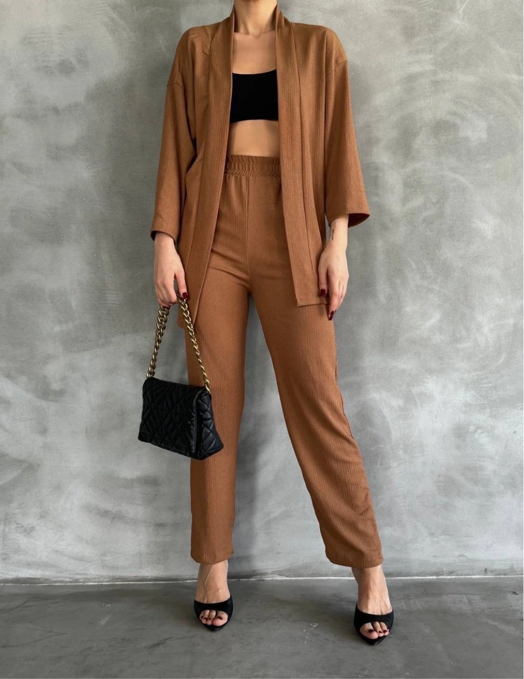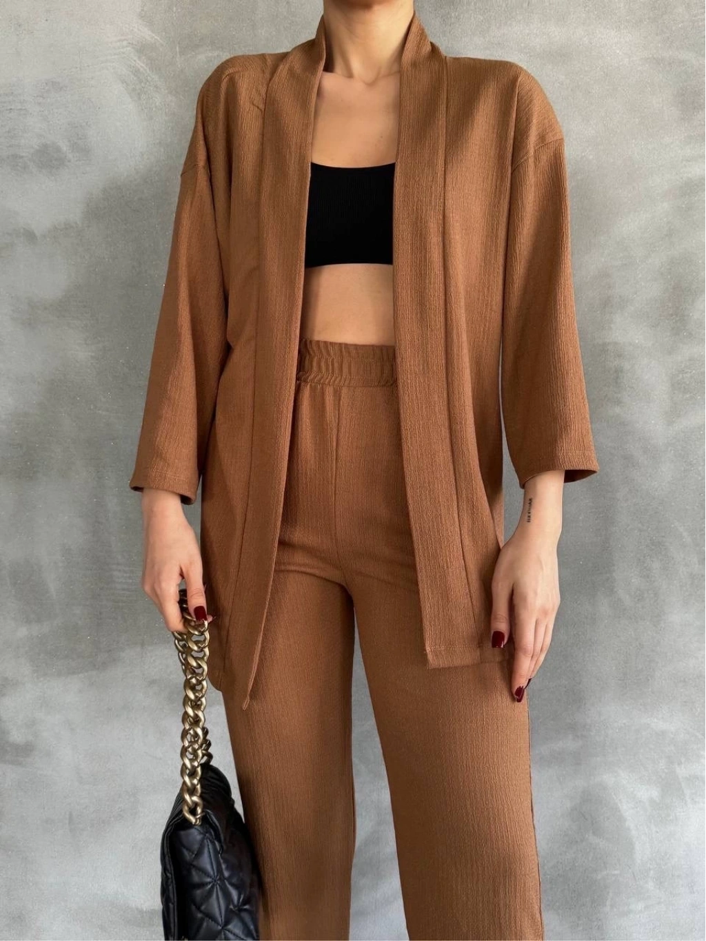 Bu bürümcük kumaş yakımlı kadın giyim takımı ile hem şık hem de rahat bir tarz yaratmak artık çok daha kolay.