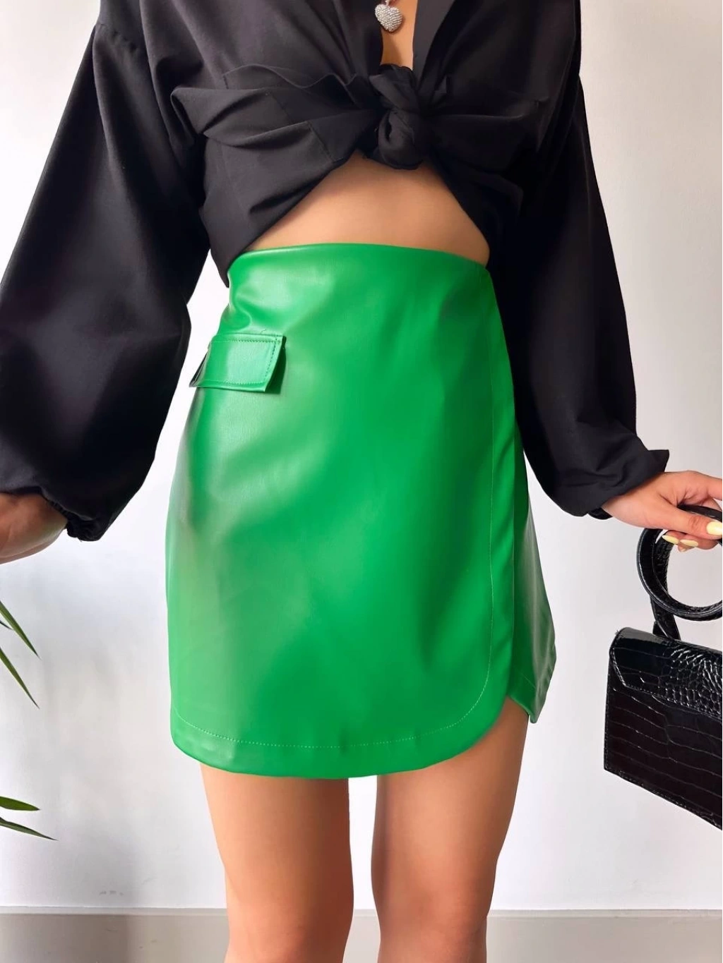 Şıklığı ve rahatlığı bir arada arayan kadınların tercihi olan Cep Detaylı Oval Kapaklı Deri Etek Yeşil, şıklığı seven kadınların gardırobunda mutlaka bulunmalı.