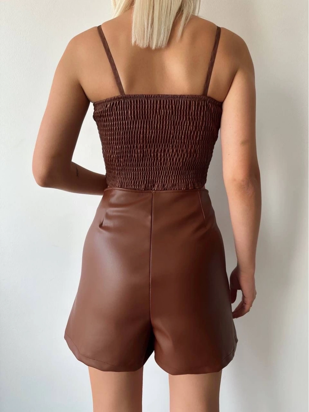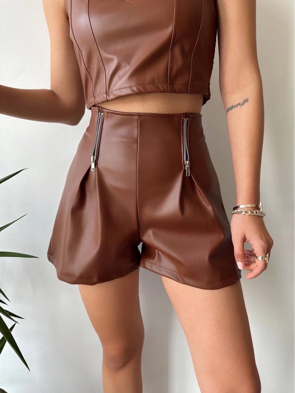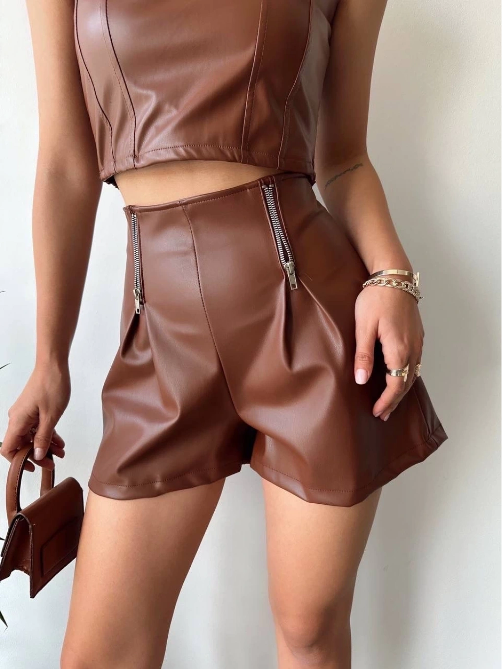 • Çift fermuarlı deri şort kahve h24394