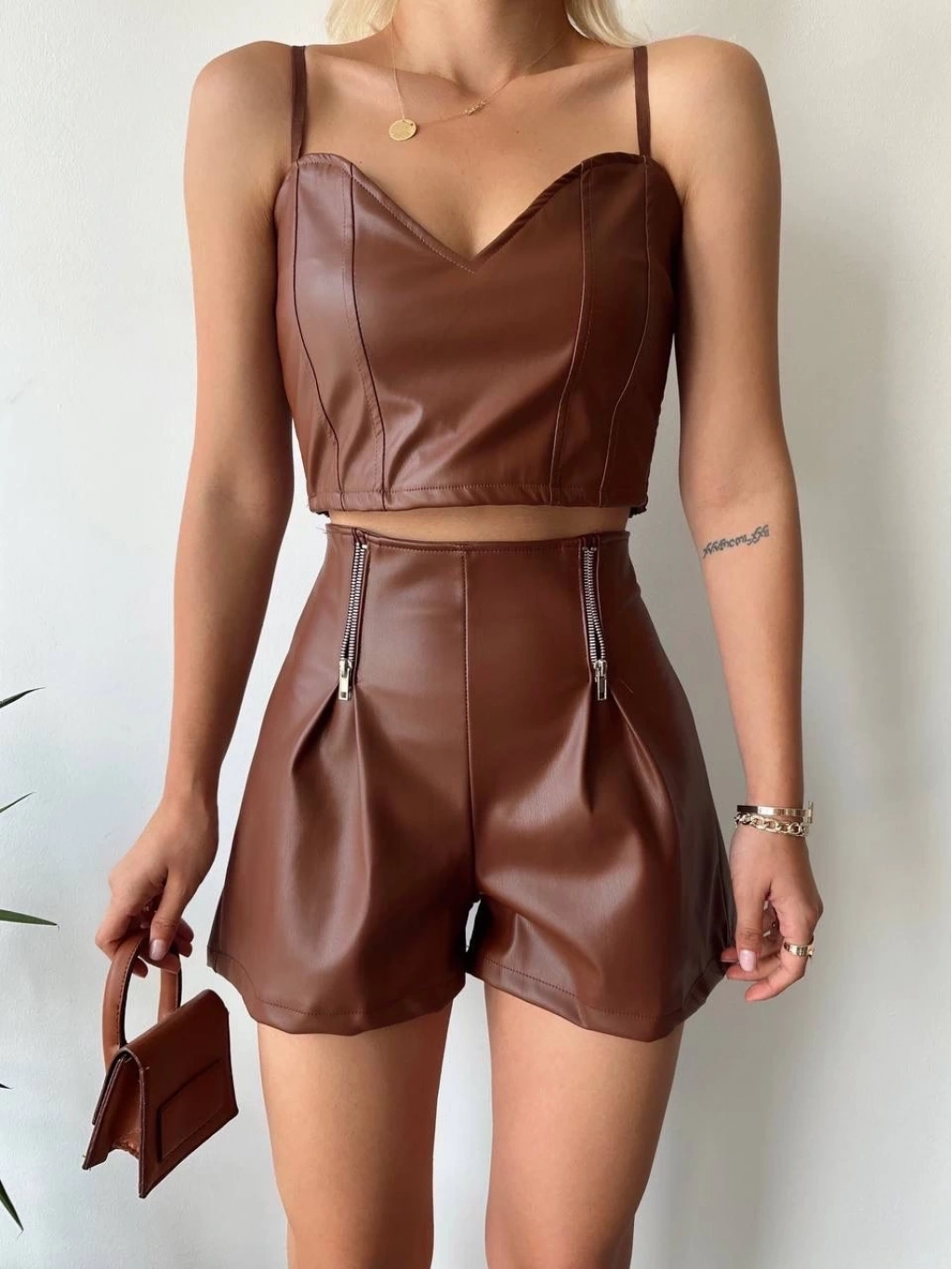 Çift fermuar detaylarıyla şıklığı ve rahatlığı bir arada sunan Kahve Deri Şort ile tarzınızı yansıtın.