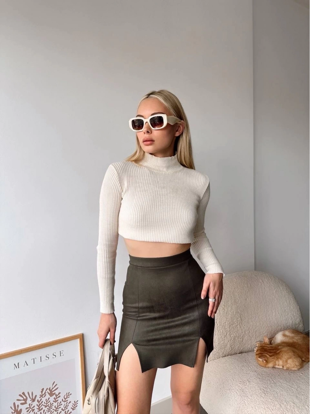 Çift yurtmaçlı süet etek haki S241002, şıklığı ve rahatlığı bir arada arayan kadınların tercihi olacak. Siz de gardırobunuza ekleyerek şıklığınızı tamamlayabilirsiniz!