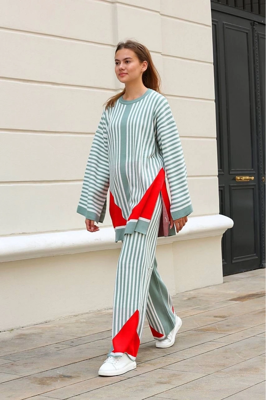 Kadınların şıklığına şıklık katacak Çizgili Bisiklet Yaka Triko Takım Mint, hem rahatlığı hem de şıklığı bir arada sunuyor.