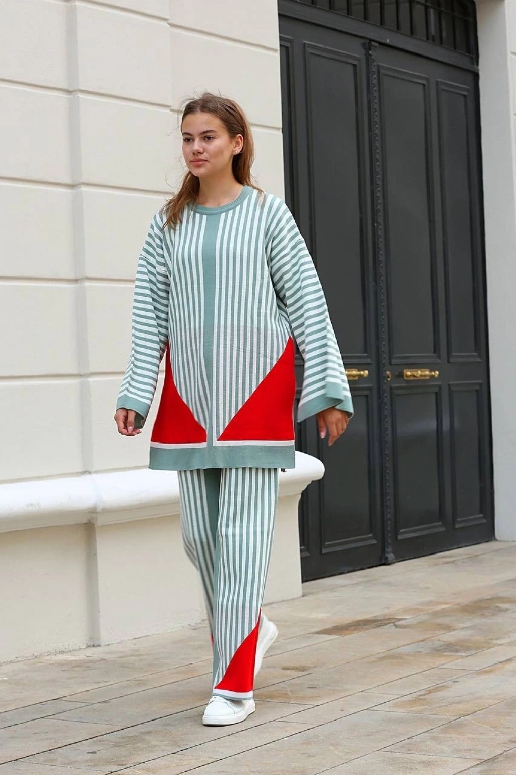 Çizgili Bisiklet Yaka Triko Takım Mint, günlük hayatta, işte ya da özel davetlerde şık ve rahat bir seçenek arayan kadınların favorisi olmaya aday!
