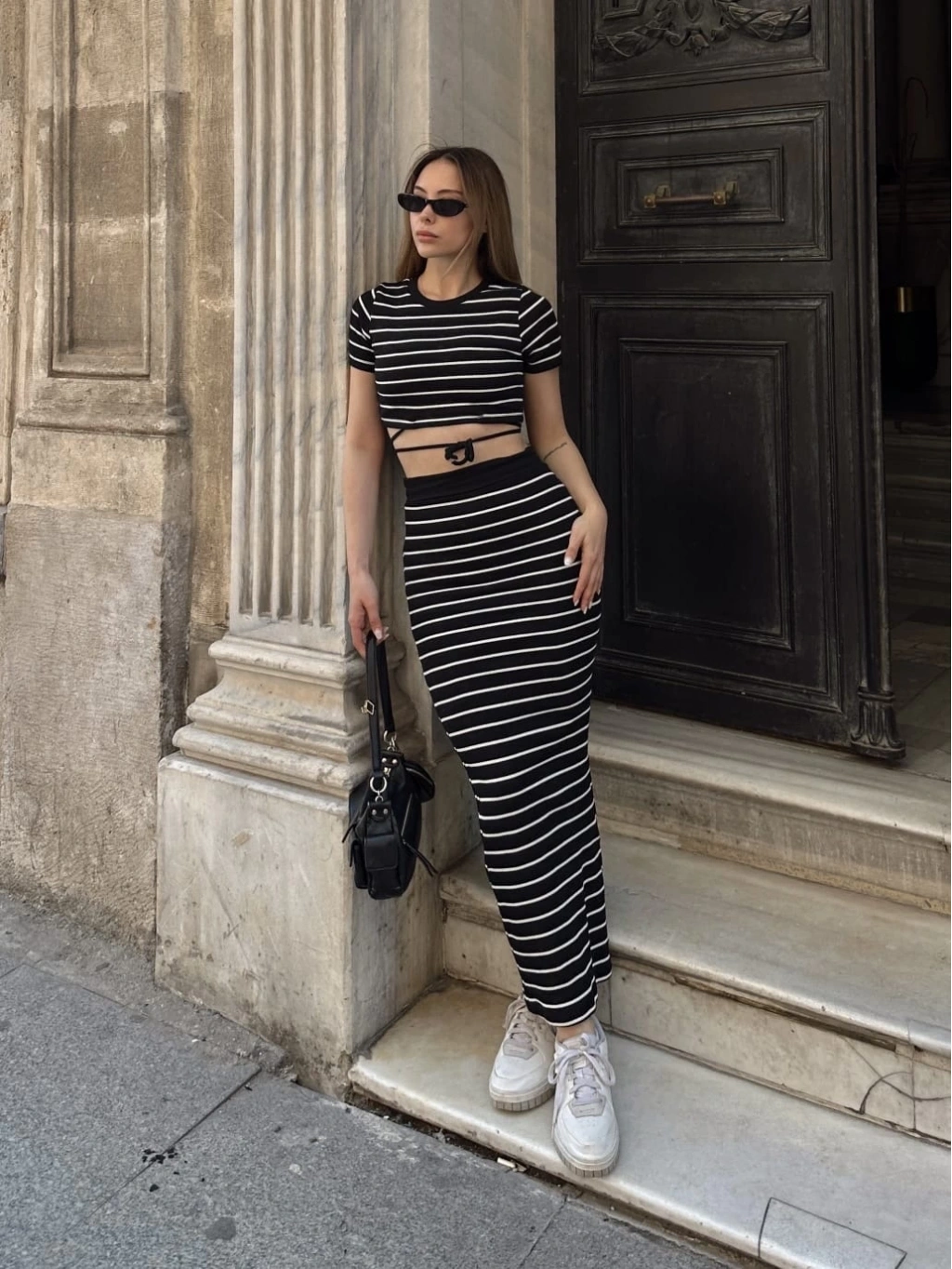 Bu siyah çizgili etekli takım, şıklık ve rahatlığı bir arada sunuyor. Hem günlük kullanıma hem de özel davetlere uygun olan bu takım, gardırobunuzun vazgeçilmezi olmaya aday.