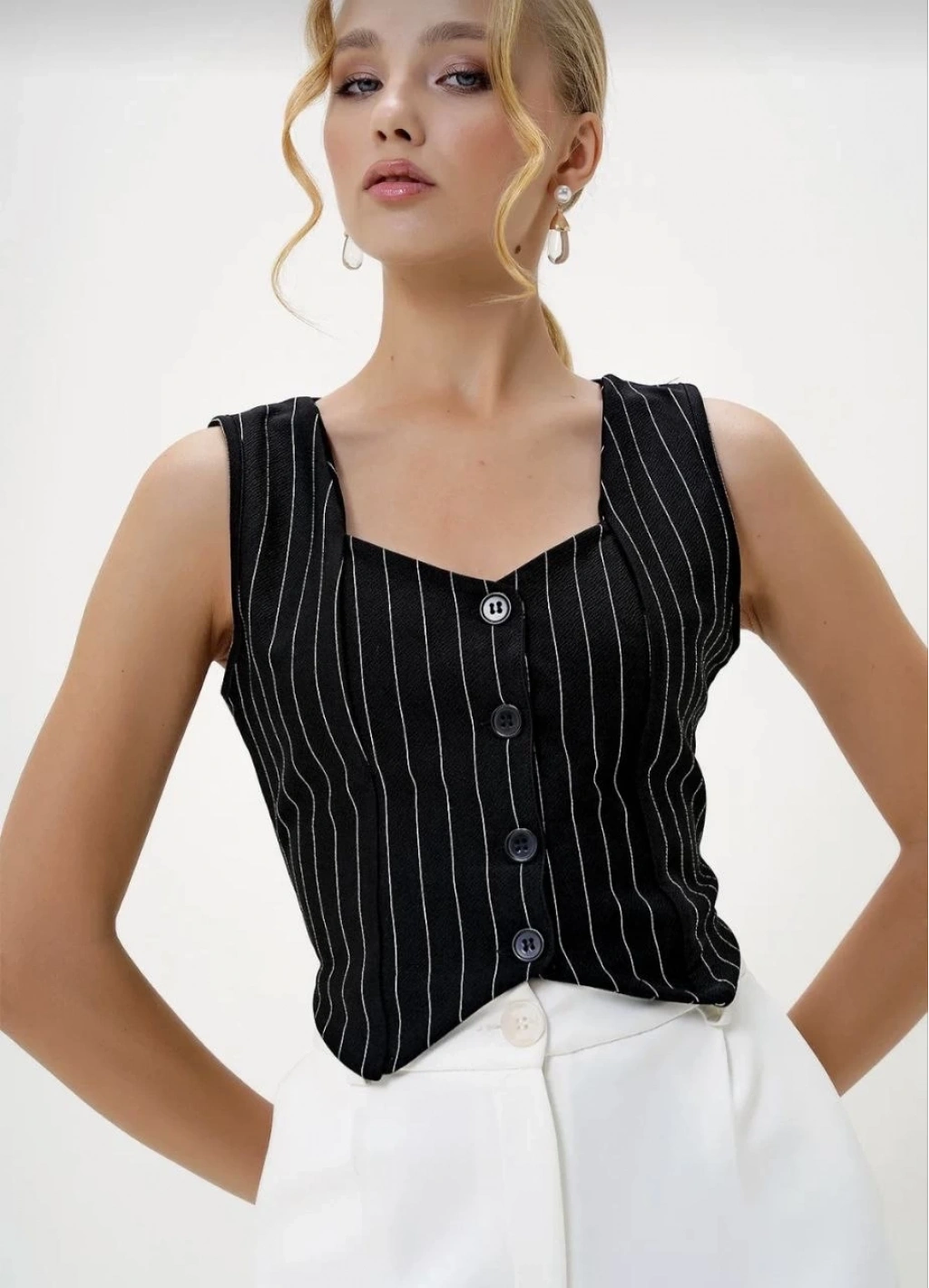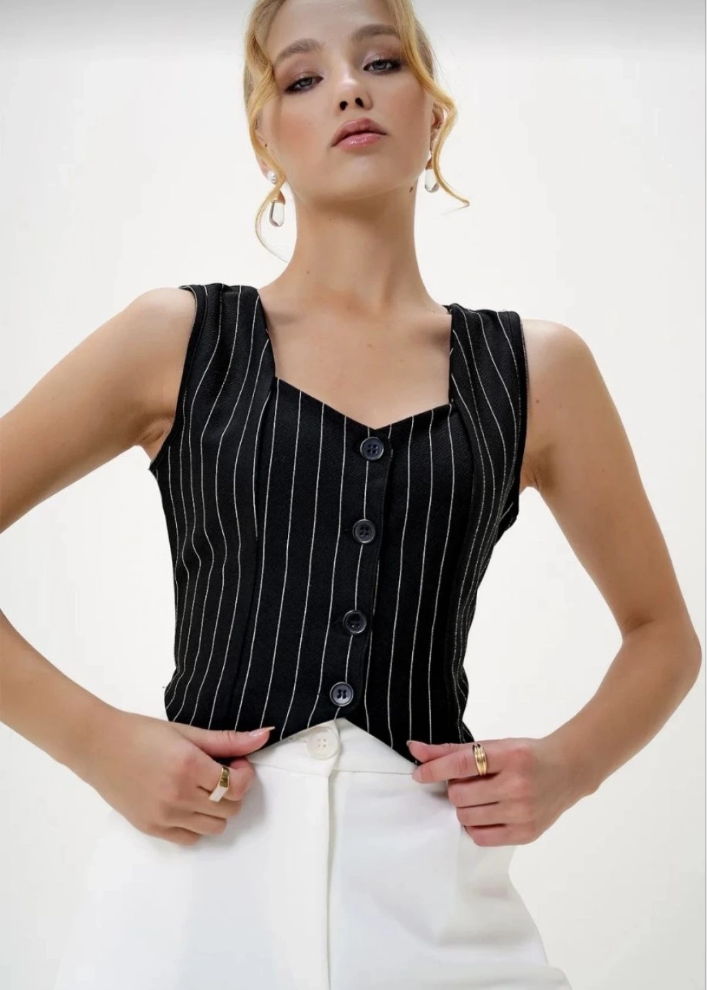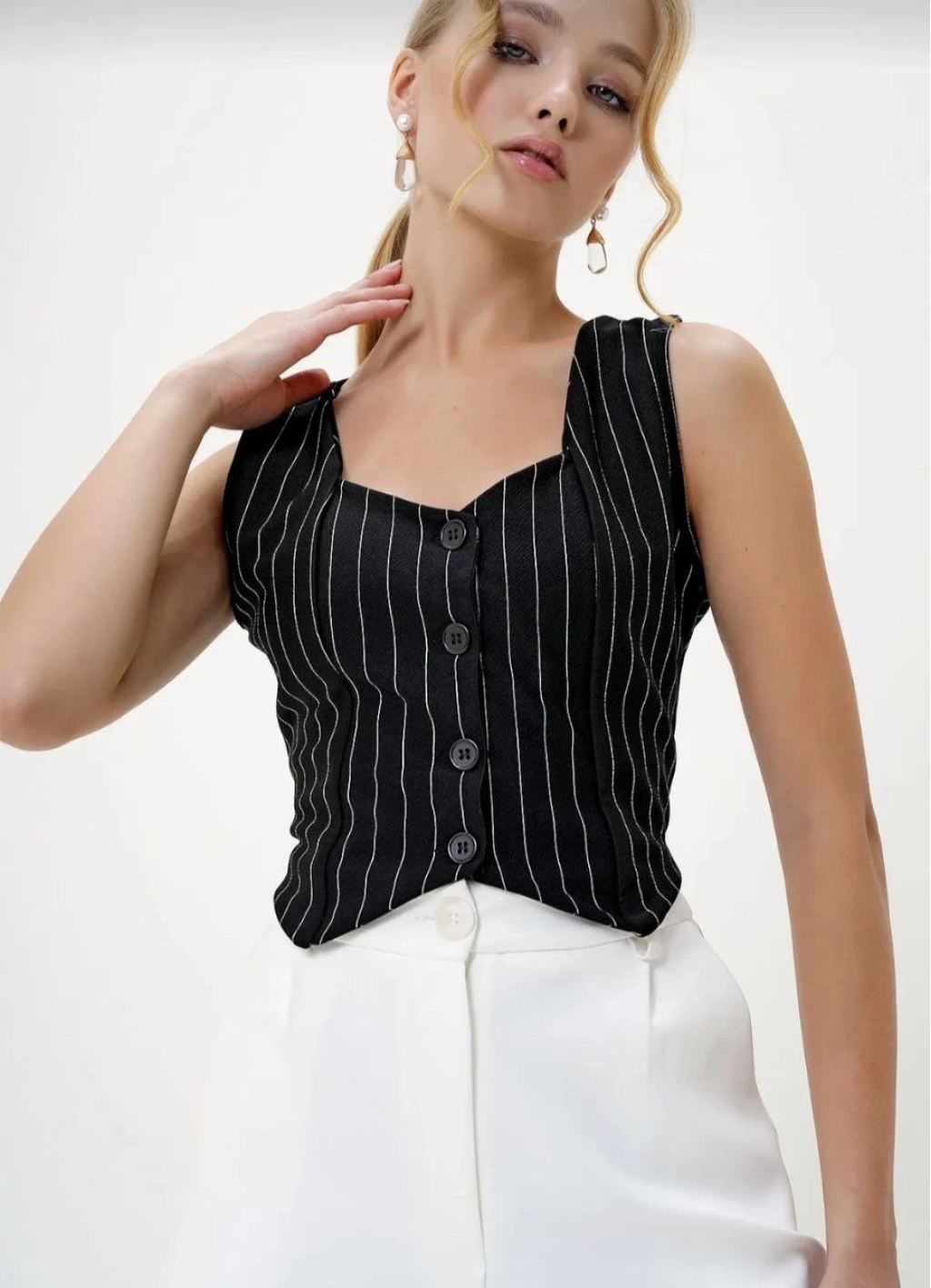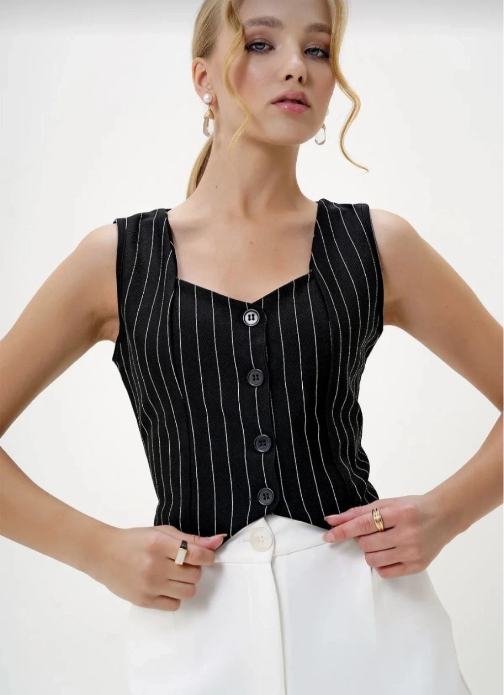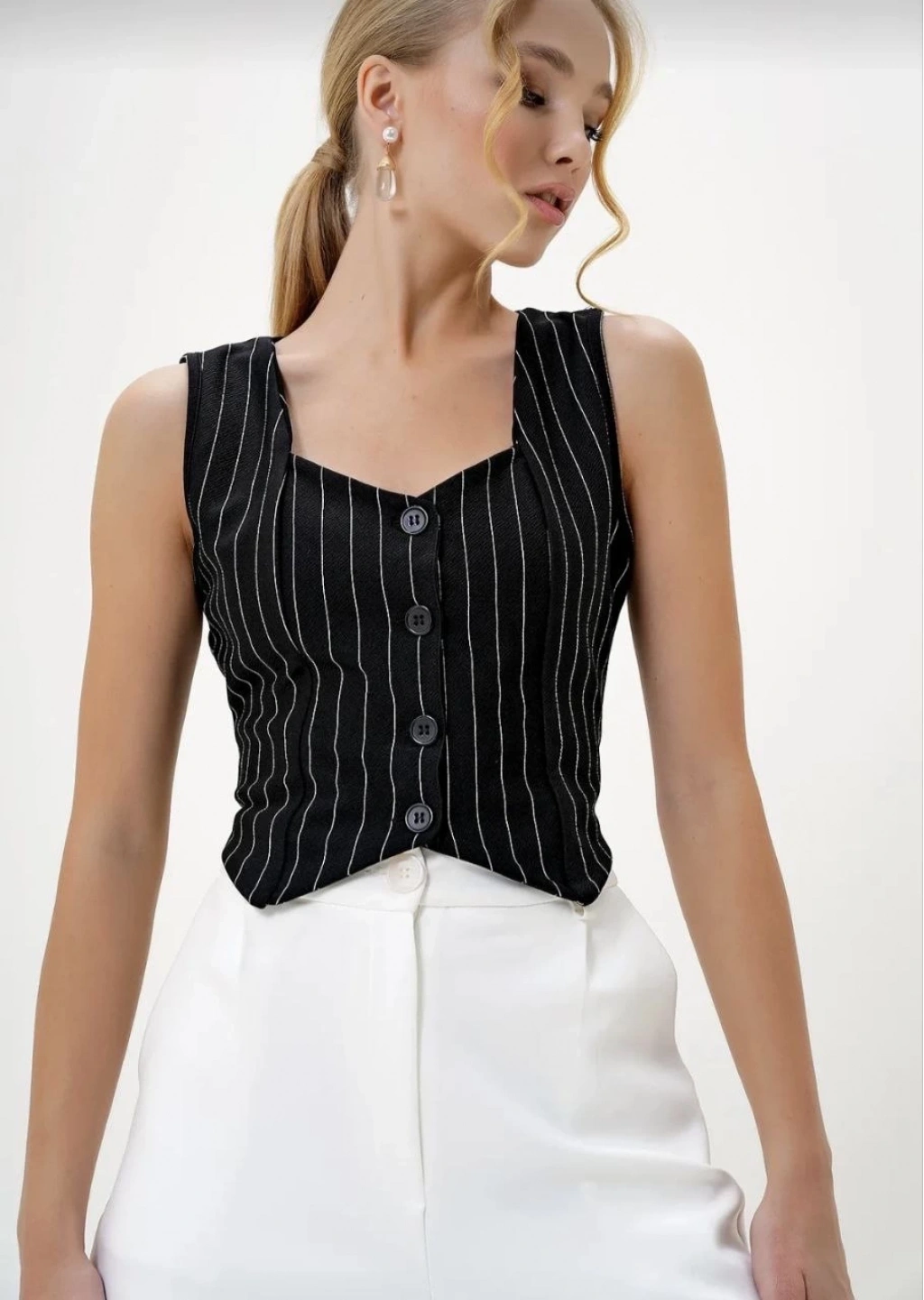 Çizgili krep düğmeli yelek siyah s3395, tarzınızı yansıtmanızı sağlayacak ve kombinlerinize şık bir hava katacak ideal bir seçenektir.