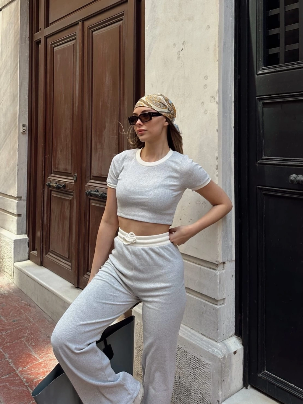 • Crop pantolon biyeli takım gri
