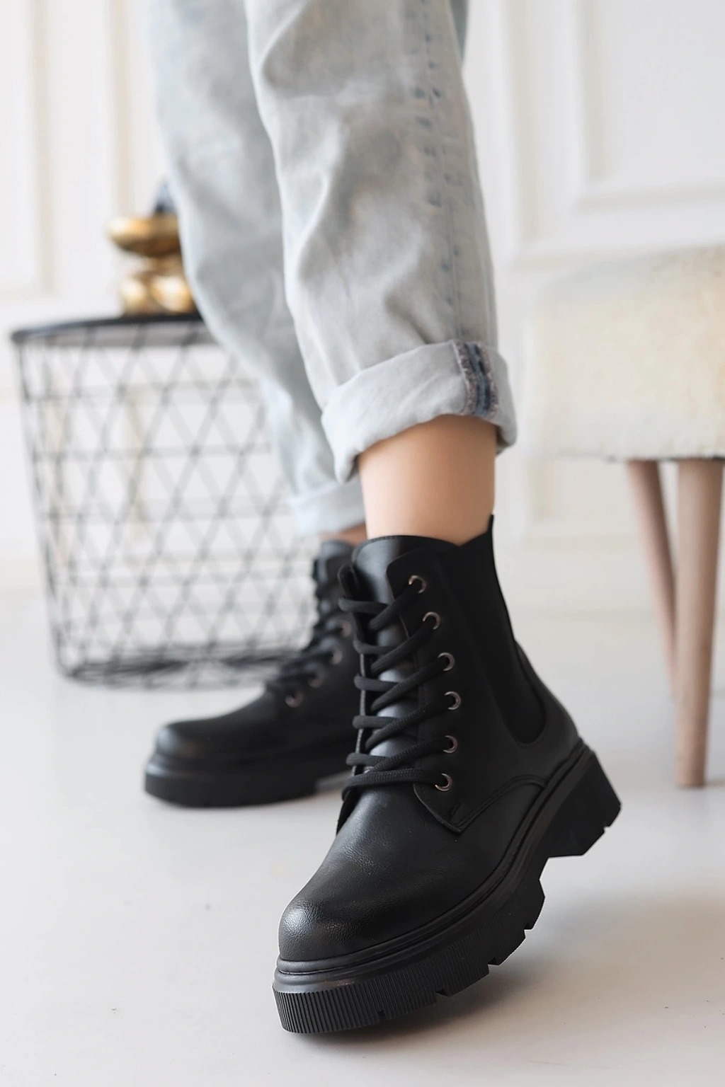 Detay : Topuklu Yandan Fermuarlı Lastikli Bağcıklı Bot