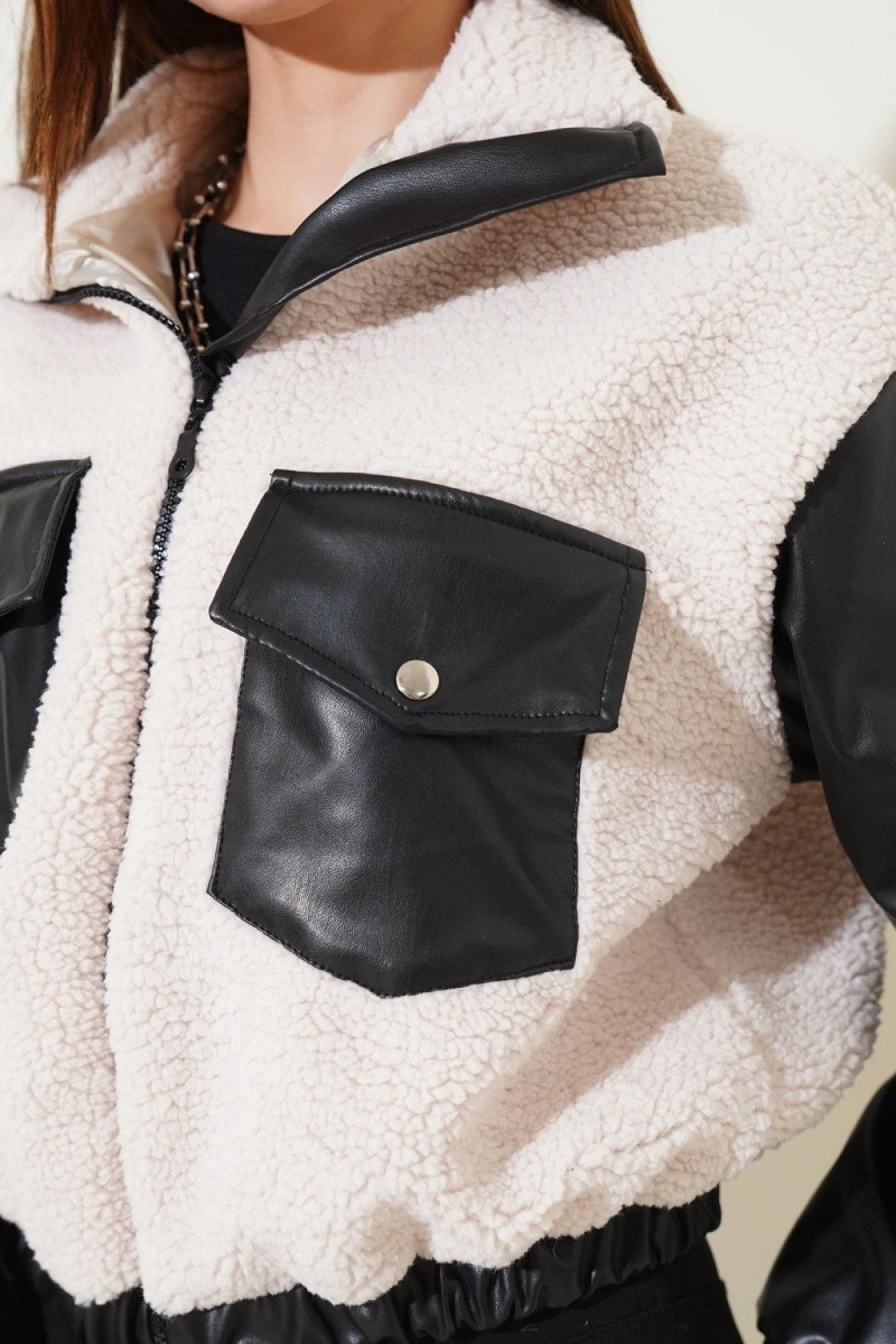 • Deri garnili cepli peluş mont siyah t1253