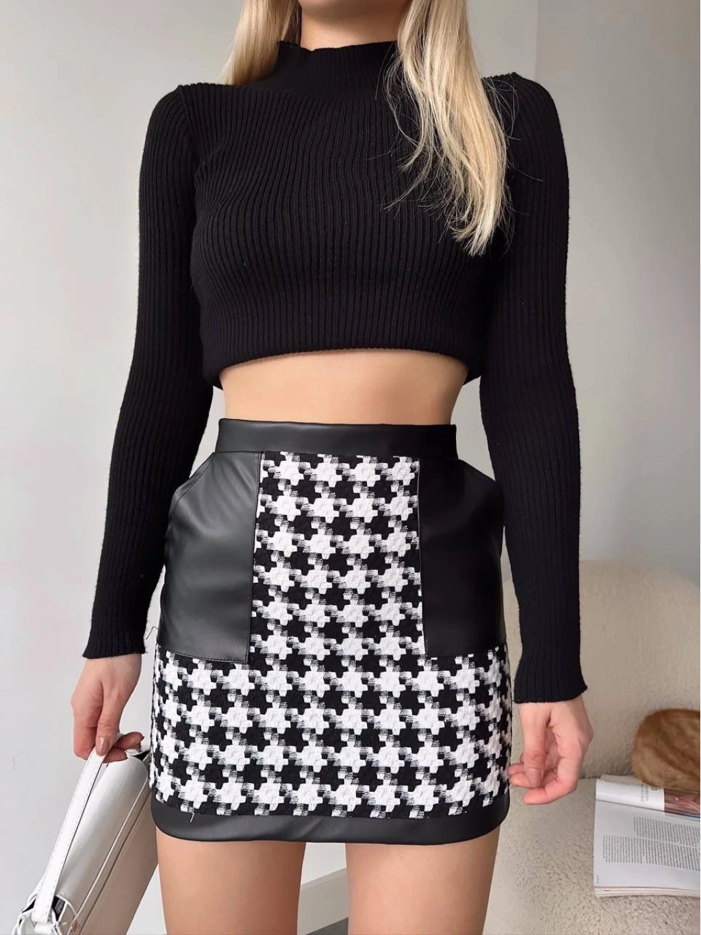 Deri garnili kaz ayağı desenli siyah eteğimiz, şıklığı ve rahatlığı bir arada sunar. Yüksek bel tasarımı ile vücudu saran kesimi, her bedene uyum sağlar. Günlük kullanıma uygun olan bu etek, farklı kombinasyonlarla hem spor hem de klasik tarzlarda kullanılabilir.