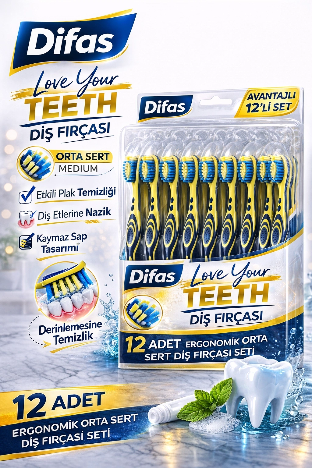 Difaş Love Your Teeth Diş Fırçası 12’li set, uzun süreli kullanım ve avantajlı paket arayanlar için ideal bir çözümdür. Orta sertlikte (Medium) kıl yapısı sayesinde diş yüzeyindeki plakların temizlenmesine yardımcı olurken diş etlerine nazik bir bakım sunar.