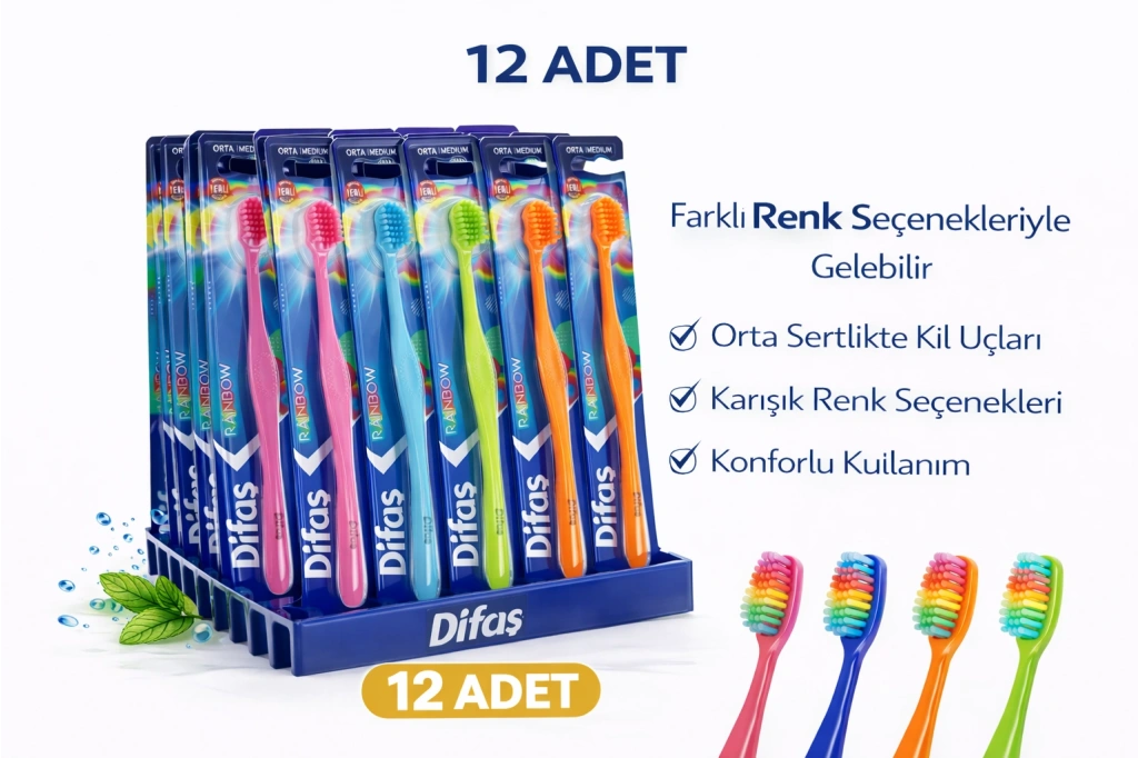 Difas Rainbow orta sert diş fırçası, günlük ağız ve diş bakımında etkili temizlik sunar. Orta sert (Medium) kıl yapısı sayesinde diş yüzeylerini ve diş aralarını nazikçe temizlerken plak oluşumunun azaltılmasına yardımcı olur.