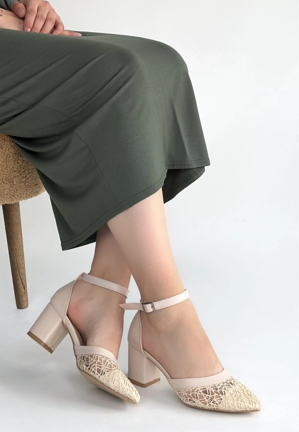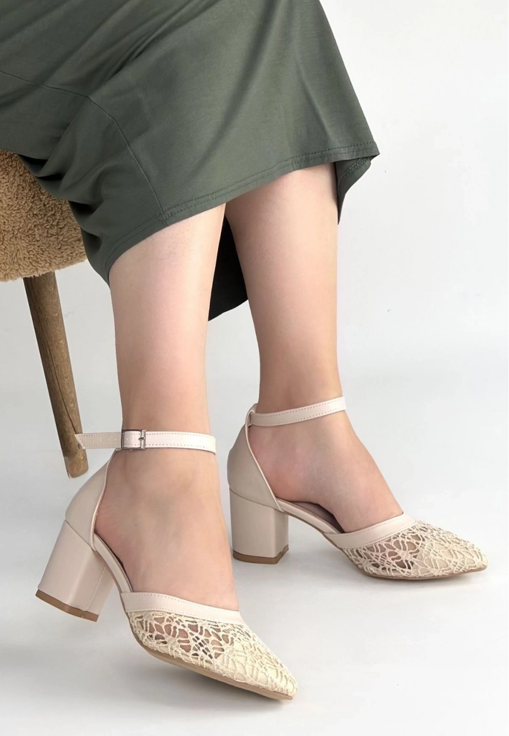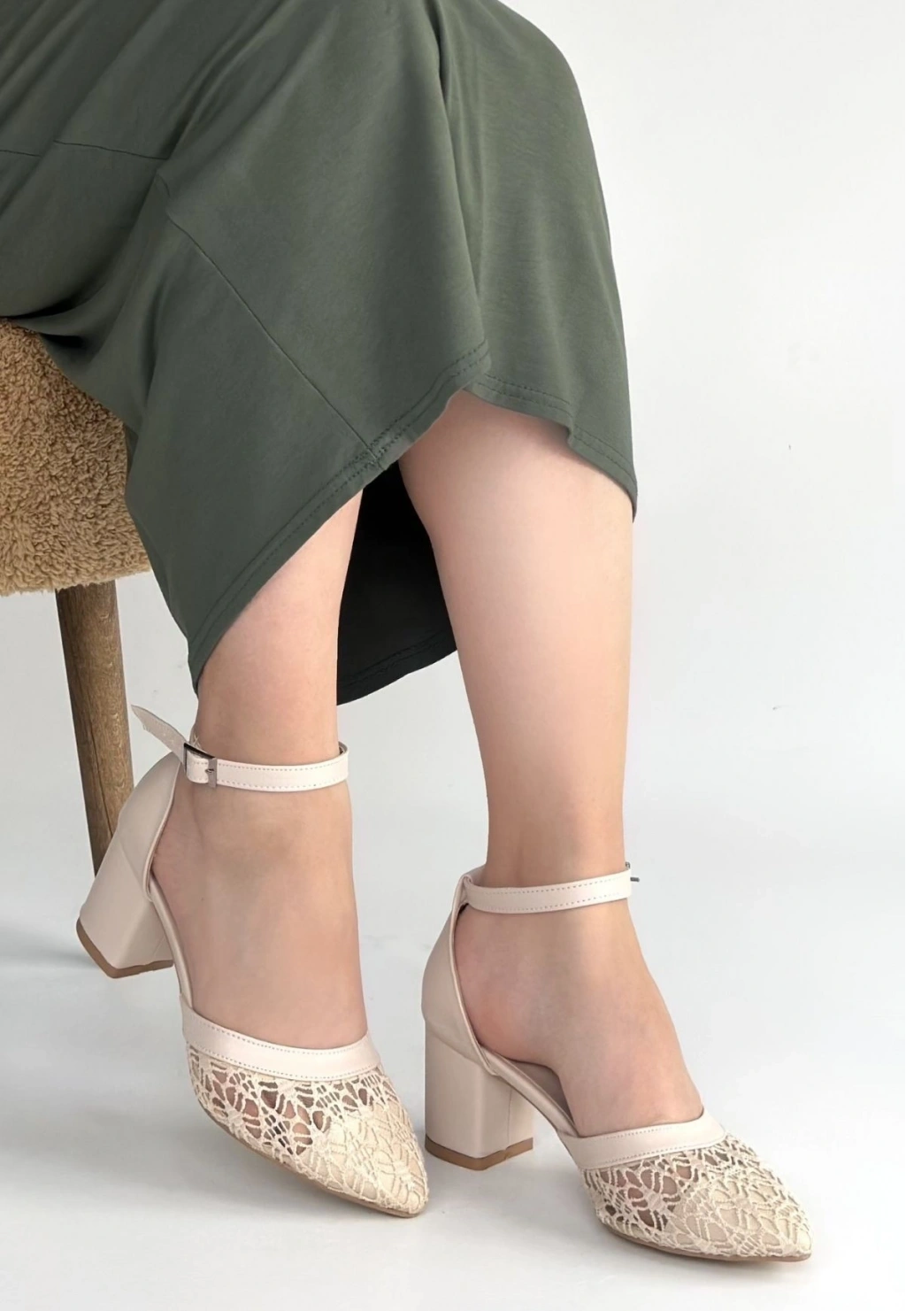 • Dmop Bej Cilt Tül Detaylı Topuklu Ayakkabı