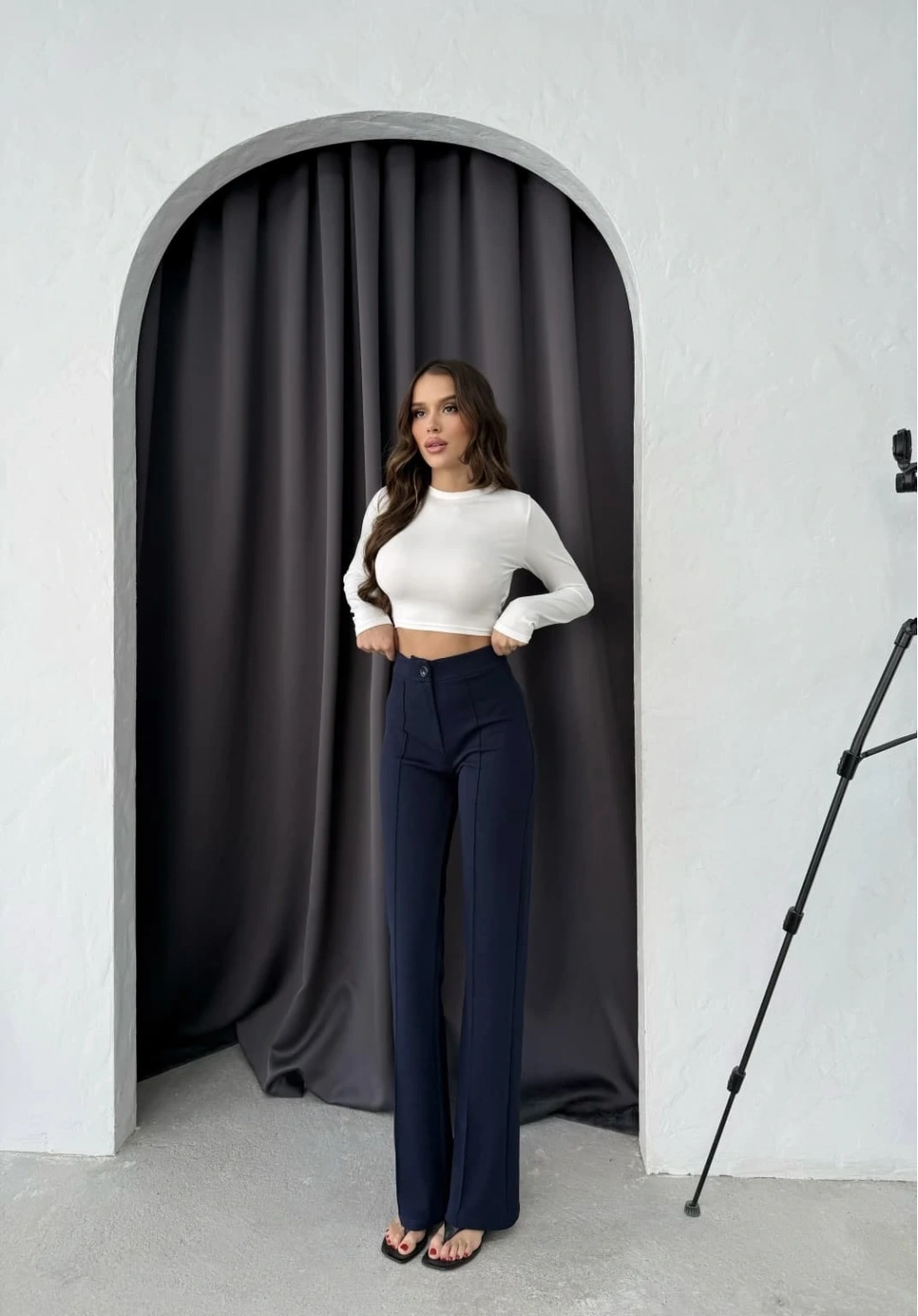 Şıklığı ve rahatlığı bir arada sunan Düğmeli Palazzo pantolon ile tarzınızı konuşturun. Yüksek bel tasarımıyla vücudu saran bu pantolon, zarif lacivert rengiyle her kombinle uyum sağlar. Geniş paçası sayesinde hareket özgürlüğü sunarken, belindeki düğme detaylarıyla da göz alıcı bir görünüm katmaktadır.