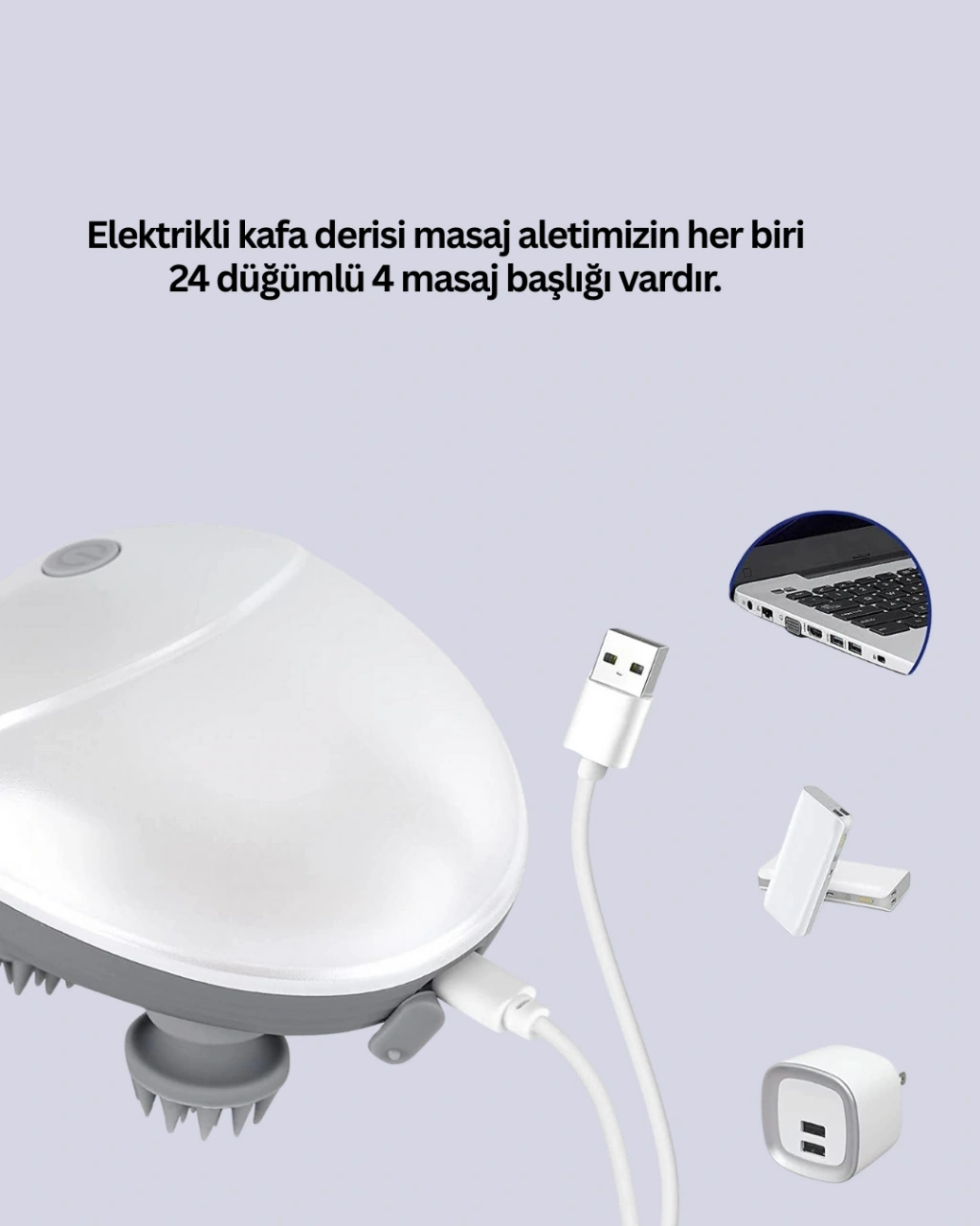 Elektrikli kafa derisi masaj aleti, günün yorgunluğunu azaltmaya yardımcı olmak ve rahatlatıcı bir masaj deneyimi sunmak için özel olarak tasarlanmıştır. Dört adet masaj başlığına sahip olan bu cihaz, her başlıkta bulunan 24 düğümlü yapısı sayesinde kafa derisine derinlemesine masaj hissi sağlar. Döner masaj hareketleri ile kafa derisinde gevşeme hissini destekler.IPX7 su geçirmez tasarımı sayesinde hem ıslak hem de kuru kullanım için uygundur. Duş sırasında veya duş sonrasında güvenle kullanılabilir. Cilt dostu malzemeden üretilmiş masaj başlıkları, hassas ciltlerde bile konforlu bir kullanım sunar. Sadece kafa derisi değil, boyun, omuz ve vücudun diğer bölgelerinde de masaj için tercih edilebilir.3 farklı hız modu sayesinde kullanıcı ihtiyacına göre masaj seviyesini ayarlayabilir. Düşük hız modu hafif ve rahatlatıcı masaj sunarken, yüksek hız modu daha yoğun bir masaj deneyimi sağlar. Alternatif hız modu ise değişken masaj hissi ile konforu artırır.Kablosuz ve şarj edilebilir yapısı sayesinde kullanım kolaylığı sunar. USB şarj kablosu ile powerbank, adaptör veya bilgisayara bağlanarak rahatlıkla şarj edilebilir. Evde, ofiste veya seyahatlerde pratik şekilde kullanılabilir.Elektrikli kafa masaj aleti, hem kişisel kullanım hem de hediye alternatifi olarak ideal bir üründür. Doğum günü, Sevgililer Günü ve özel günler için kullanışlı ve rahatlatıcı bir hediye seçeneğidir.