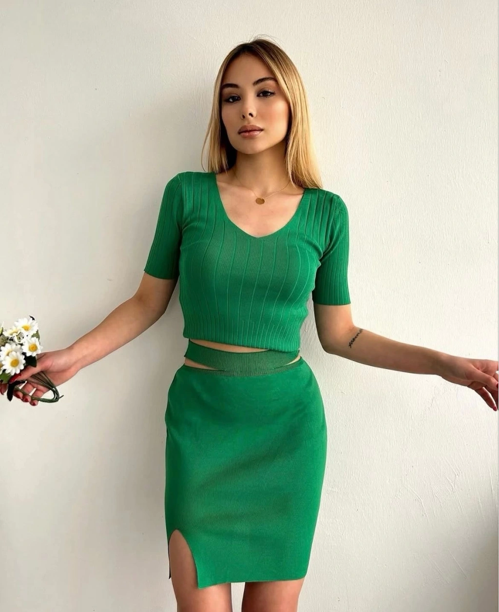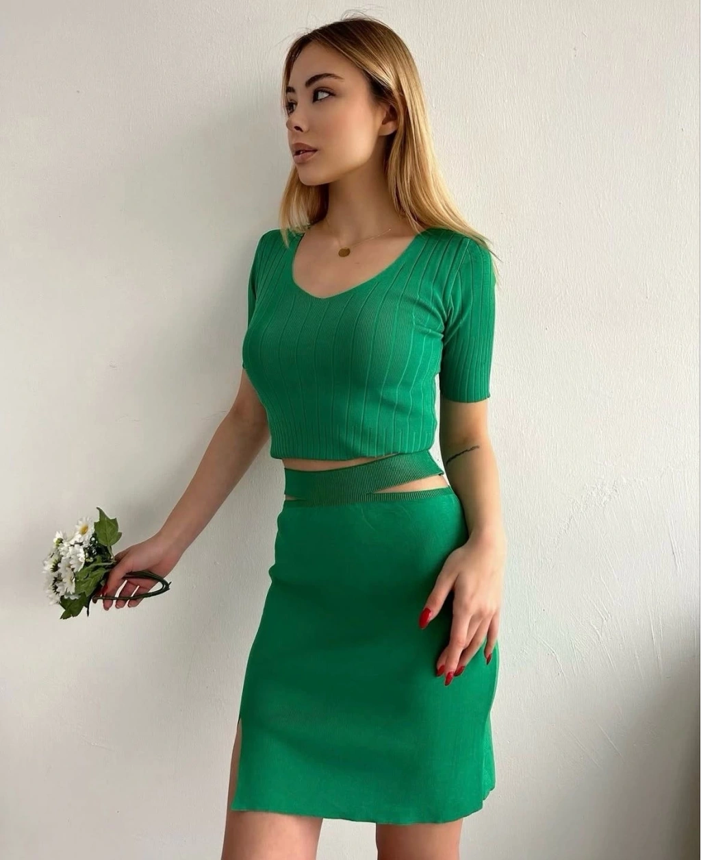 Şık detaylarıyla dikkat çeken yeşil etekli triko takım, günlük şıklık arayan kadınlar için ideal bir seçenektir.
