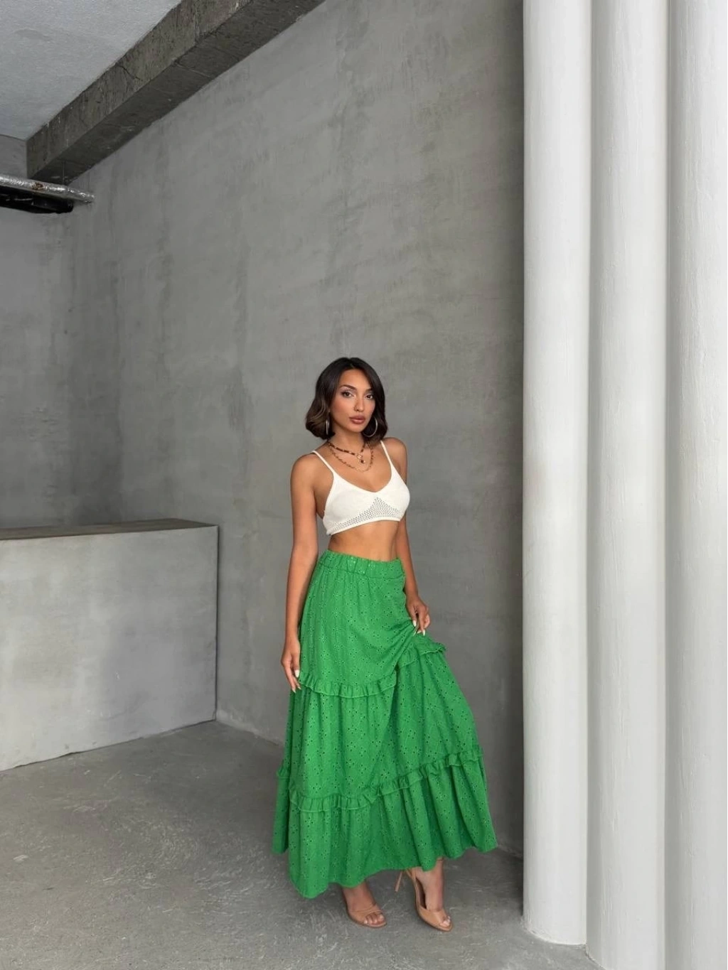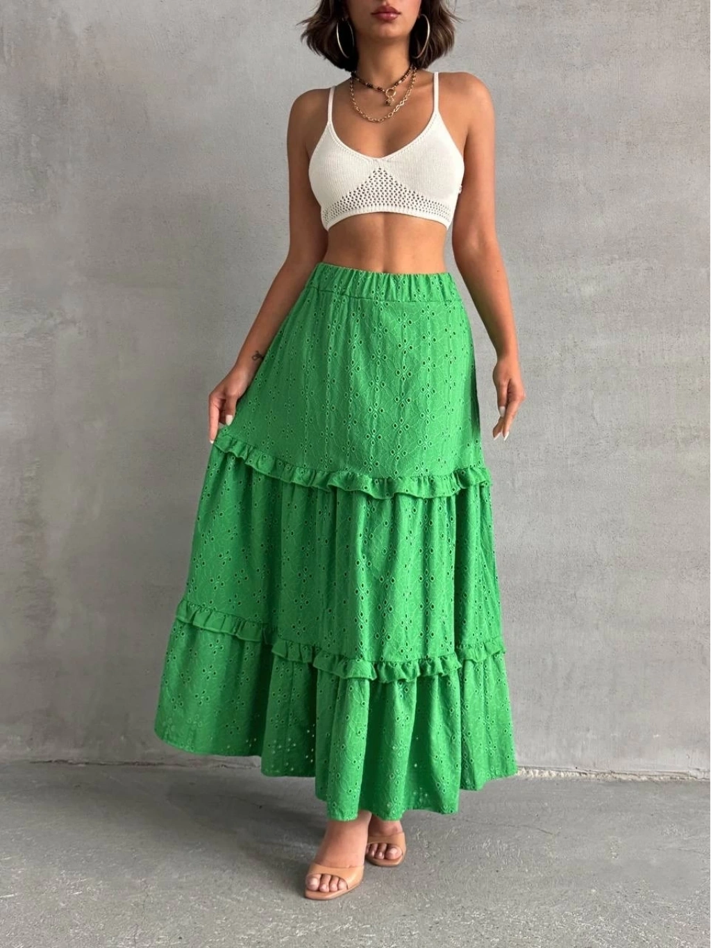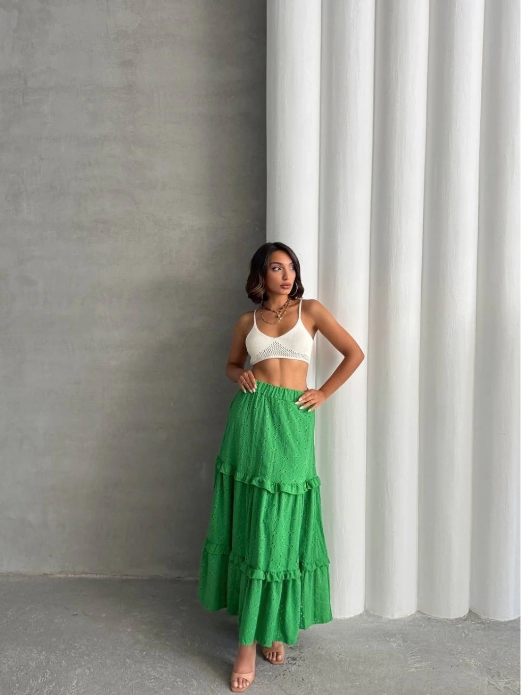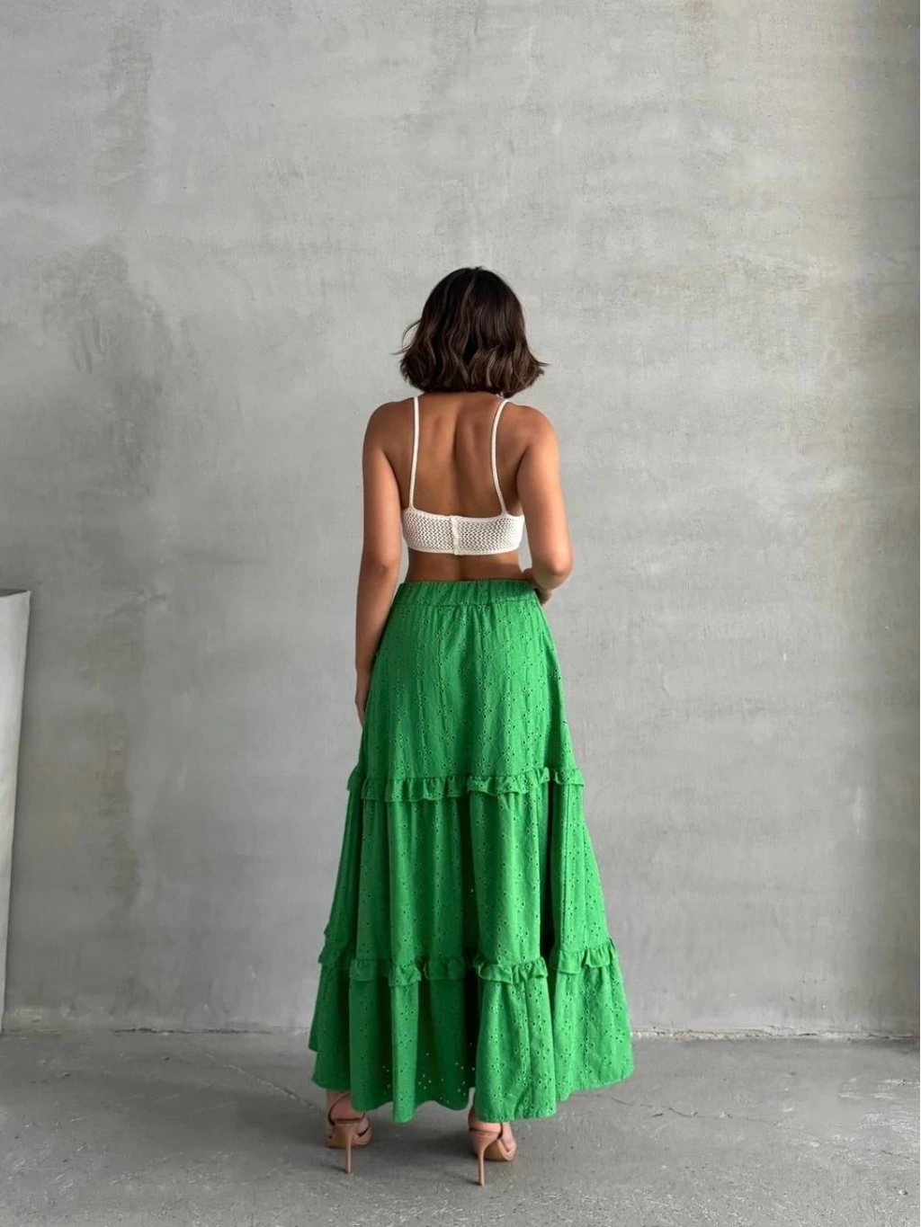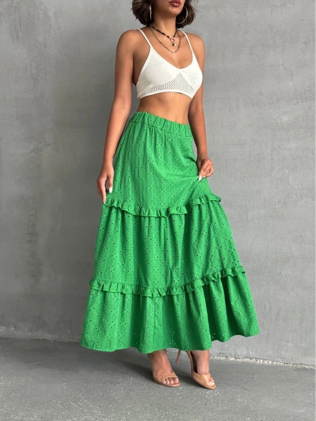 Bu sezonun trendi olan fırfırlı detaylarla hareket katan yeşil uzun eteğimiz, gardırobunuzun vazgeçilmezi olmaya aday! Çift taraflı brode işlemeleri ile şıklığı ve zarafeti bir arada sunan tasarım, her durumda size şıklık katacak. Astarlı yapısı sayesinde rahatça kullanabileceğiniz eteğimiz, şık bluz ve topuklu ayakkabılarla kombinleyerek göz kamaştırıcı bir görünüm elde etmenizi sağlayacak.