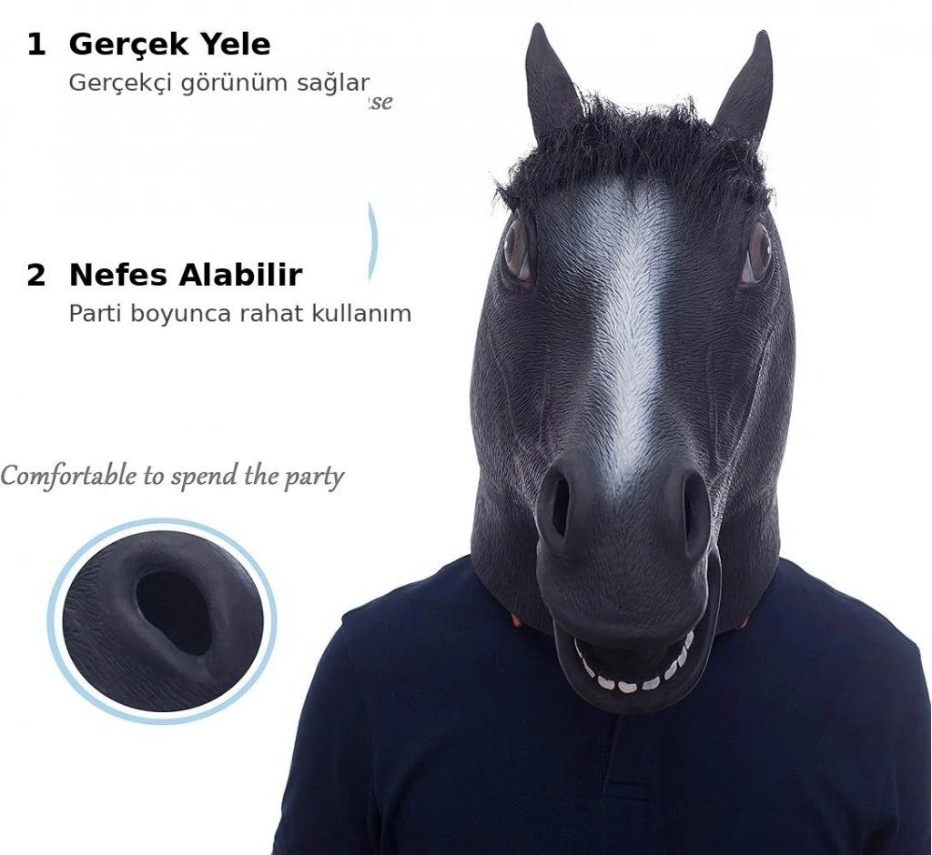 Eğlenceyi artıran bu komik at maskesi, farklı ve dikkat çekici bir görünüm isteyen herkes için mükemmel bir kostüm aksesuarıdır.
