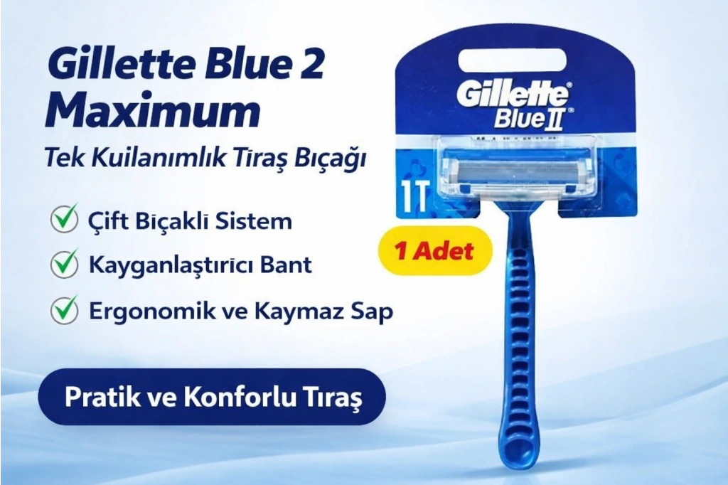gillette blue 2 maximum, tek kullanımlık tıraş bıçağı, gillette tıraş bıçağı, erkek tıraş bıçağı, çift bıçaklı jilet, gillette blue 2, uygun fiyatlı tıraş bıçağı, pratik tıraş ürünü, erkek bakım ürünleri, tekli jilet