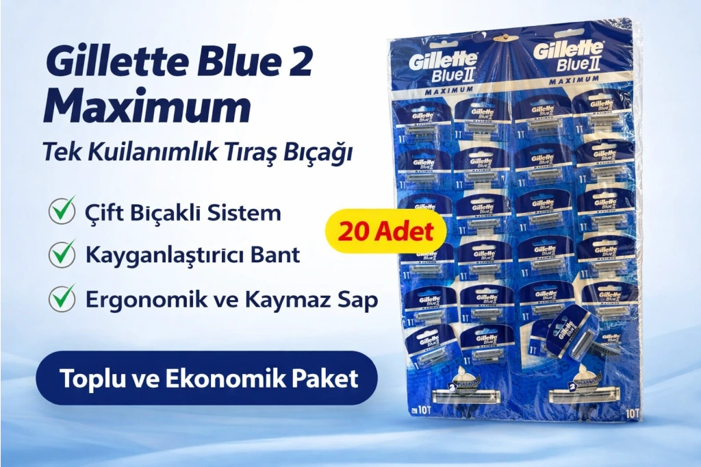 gillette blue 2 maximum, gillette tıraş bıçağı 20 adet, tek kullanımlık tıraş bıçağı, gillette blue 2 ekonomik paket, çift bıçaklı jilet, toplu tıraş bıçağı, erkek bakım ürünleri, uygun fiyatlı jilet, gillette tek kullanımlık bıçak, büyük paket tıraş bıçağı