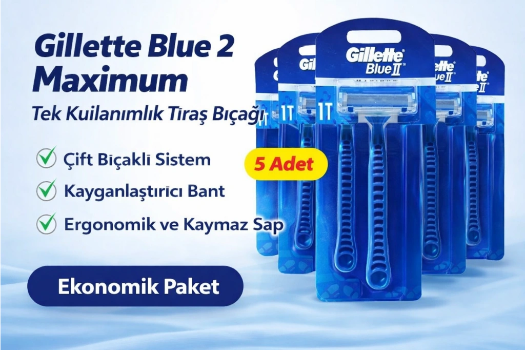 gillette blue 2 maximum, gillette tıraş bıçağı 5 adet, tek kullanımlık tıraş bıçağı, çift bıçaklı jilet, gillette blue 2, ekonomik tıraş bıçağı paketi, erkek bakım ürünleri, uygun fiyatlı jilet, pratik tıraş ürünleri, gillette tek kullanımlık bıçak