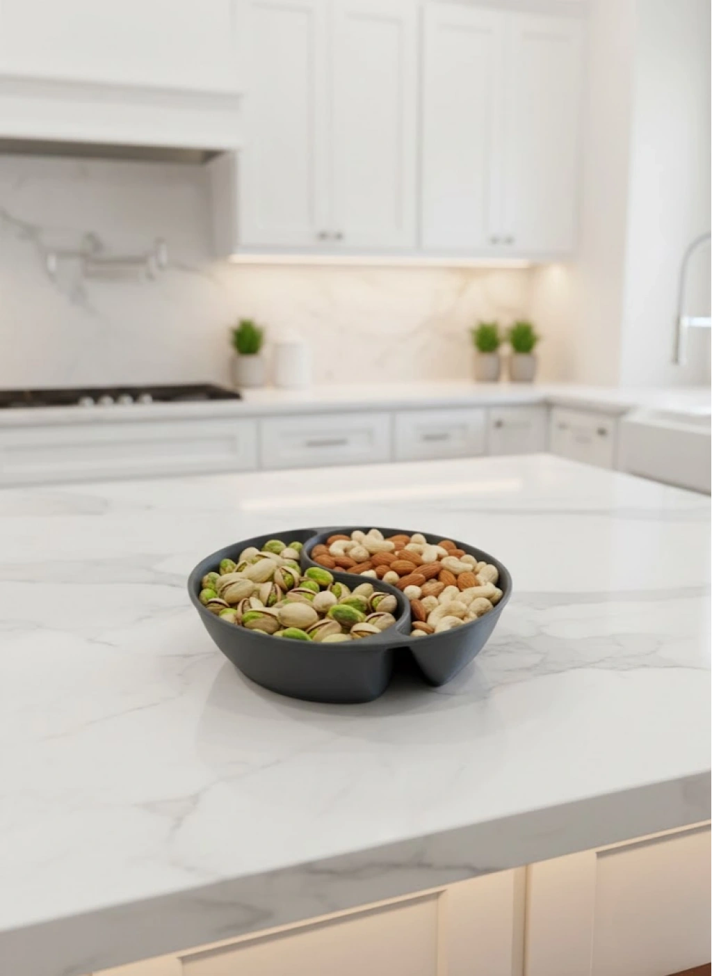Modern ve sade tasarımıyla öne çıkan gri çerezlik kase seti, hem günlük kullanım hem de misafir sunumları için ideal bir çözüm sunar. Set içerisinde yer alan 4 adet kase, bölmeli yapısı sayesinde farklı çerezleri, kuruyemişleri veya atıştırmalıkları birbirine karıştırmadan servis etmenizi sağlar. Minimal formu ve nötr gri rengi ile salon, oturma odası ve mutfak dekorasyonuna kolayca uyum sağlar.Loş ya da aydınlık ortamlarda estetik bir görünüm sunan bu çerezlikler, sehpa üzerinde, masa üstünde veya raflarda şık bir tamamlayıcı olarak kullanılabilir. Dayanıklı yapısı sayesinde uzun süreli kullanıma uygundur ve günlük temizlikte pratiklik sağlar. Film geceleri, davetler, kahve sunumları ve özel günlerde düzenli ve zarif bir sunum arayanlar için ideal bir tercihtir.