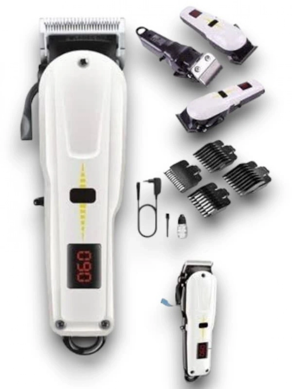 Profesyonel Şarjlı Saç ve Sakal Kesme Makinesi Profesyonel kuaförlerin tercihi olan  Profesyonel saçlı saç ve sakal kesme makinesi mükemmel tutuş ve kavrama sağlamak için özel olarak tasarlanmıştır. Ergonomik özelliklerinin yanı sıra yenilikçi ve şık görünüme sahiptir Keskin ve Dayanıklı Çelik Bıçaklar Profesyonel saç ve sakal kesme makinesi, en sert kılların bile tek seferde kesilmesini sağlayan keskin ve dayanıklı çelik bıçaklara kusursuz kesim performansı ortaya koyar. Uzun ömürlü olması için birinci sınıf kalitedeki materyalden üretilmiştir Uzun Kullanım Süresine Sahip Lityum Batarya Kablosuz kullanım rahatlığına sahip  Profesyonel saç ve sakal kesme makinesi uzun kullanım süresine sahiptir. Yaklaşık 4 saatte maksimum şarja ulaşan lityum bataryası sayesinde 150 dakikaya kadar kesintisiz saç ve sakal kesme imkanı tanır Güçlü ve Sorunsuz Motor Avantajı 220-240 V 50/60 Hz 3W voltaj seviyesine sahip güçlü motora sahiptir. Motor gücü 3.6 Volttur. Bu sayede hem saç hem de sakal kesiminde sorun yaşamadan profesyonel tıraş avantajı sunar Islak ve Kuru Tıraşa Uygun Tasarım Profesyonel kuaförlerin tercihi  Profesyonel saç ve sakal kesme makinesi hem ıslak hem de kuru saç ve sakal kesiminde kullanılabilir Profesyonel Kesim İçin Kılavuz Tarak Aksesuarları Her saç ve sakal kesim tarzına mükemmel uyum için 4 adet kılavuz tarağı ile birlikte gelir.