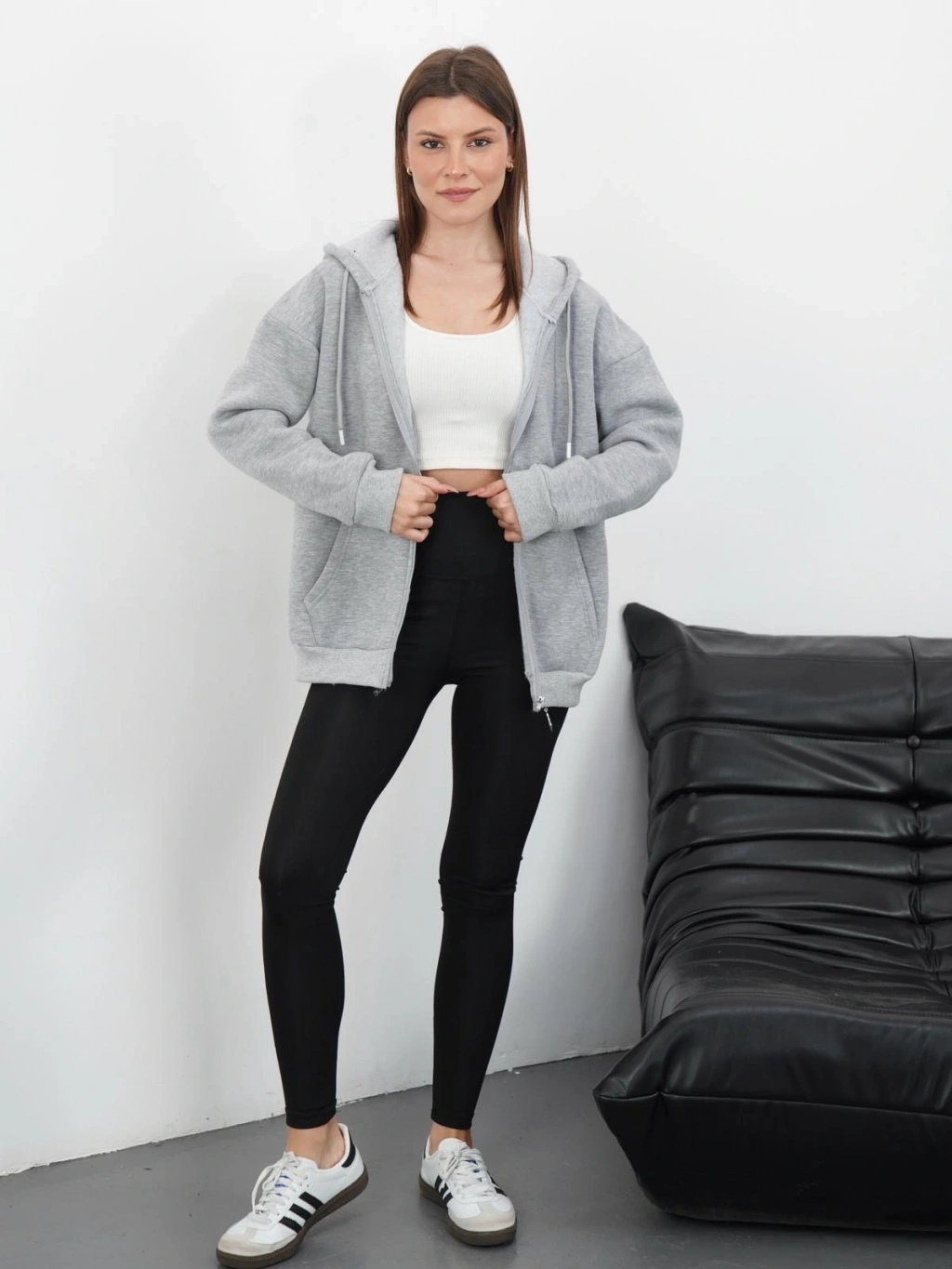 3 iplik şardonlu fermuarlı kapşonlu hırka gri