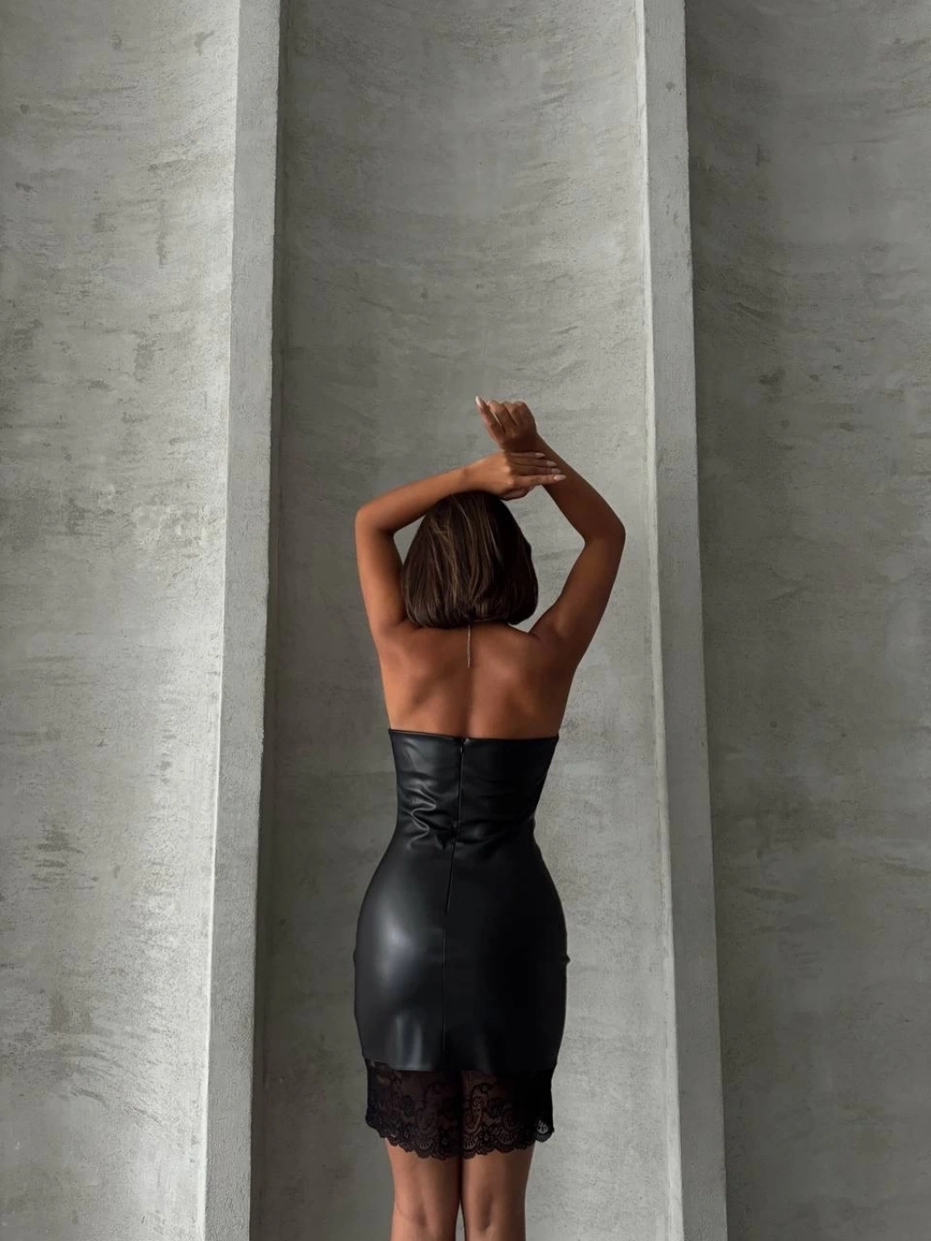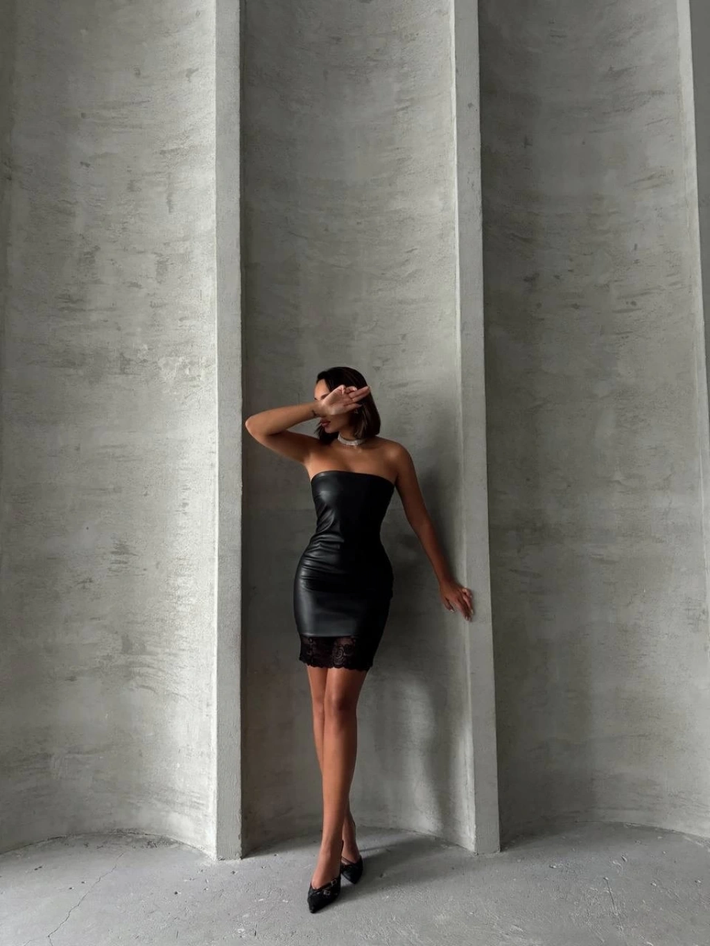 Altı dantelli straplez deri elbise siyah w240419