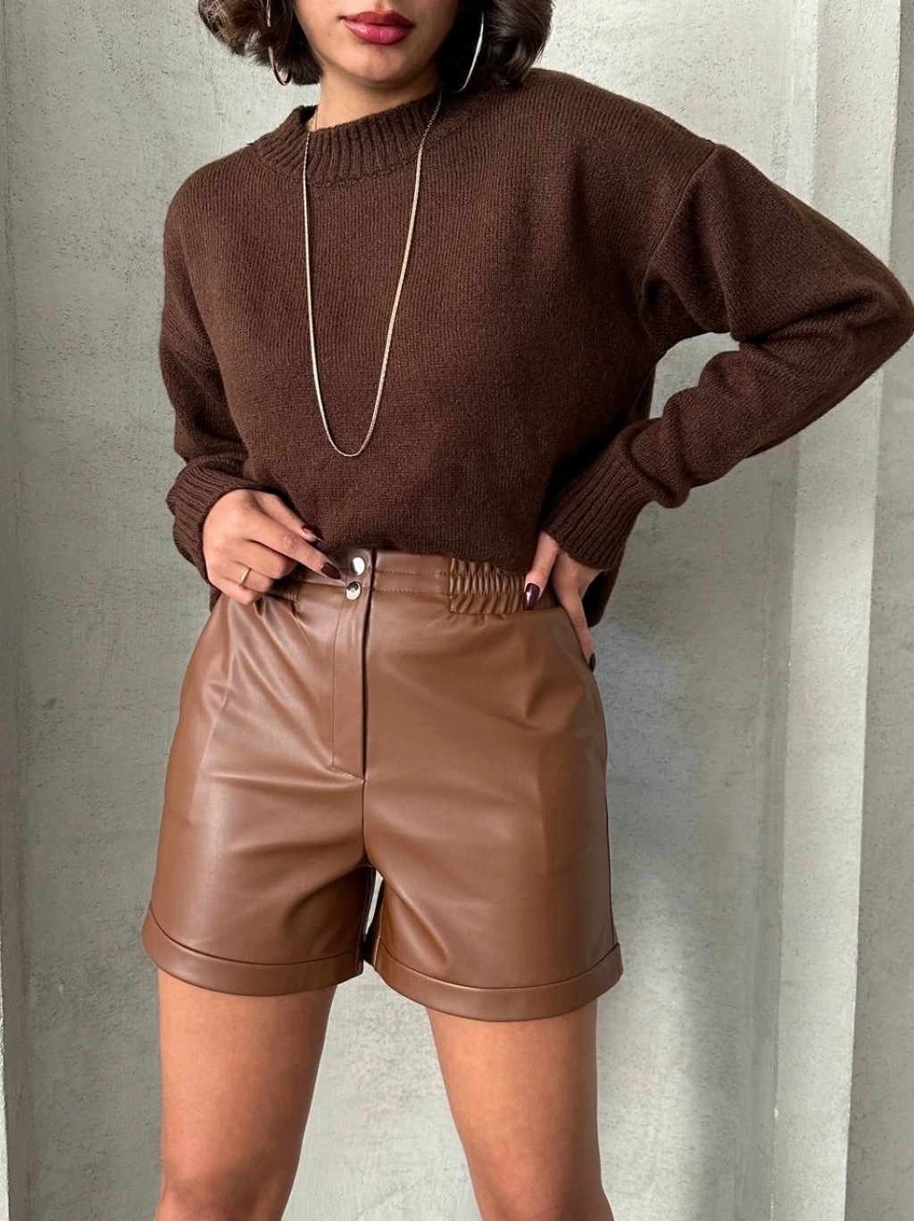 Beli lastikli çıtçıtlı deri şort kahve w241007