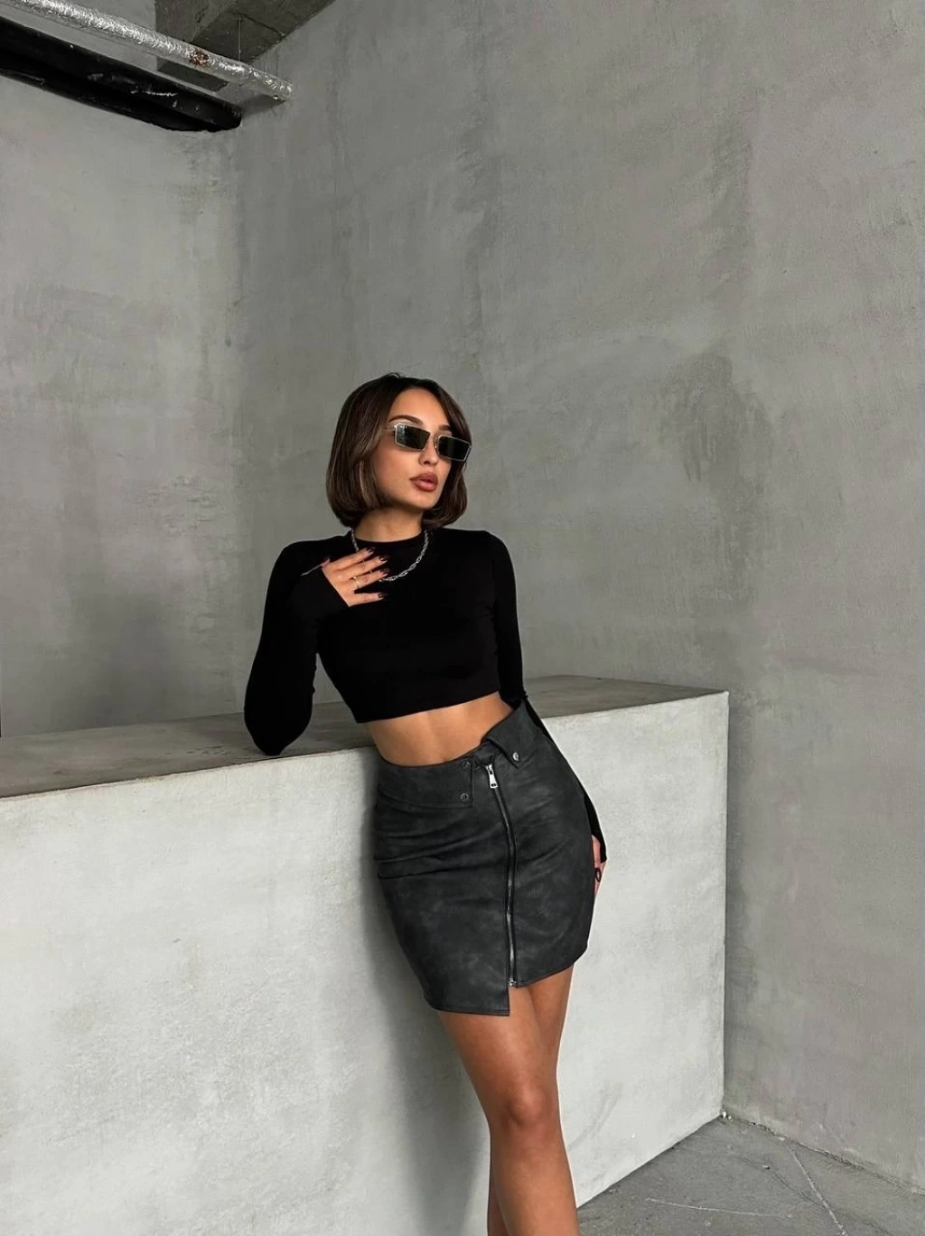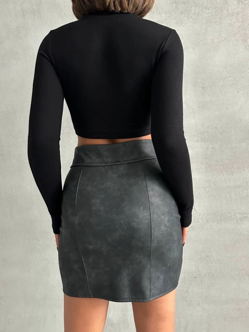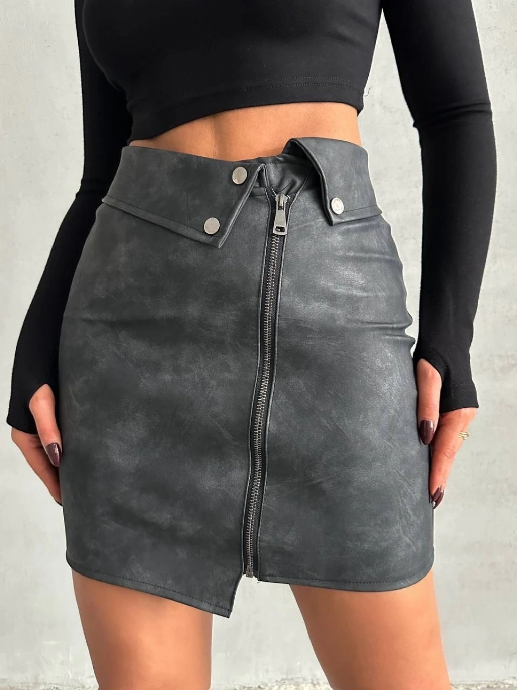 Beli pervazlı fermuarlı eskitme deri etek w24431