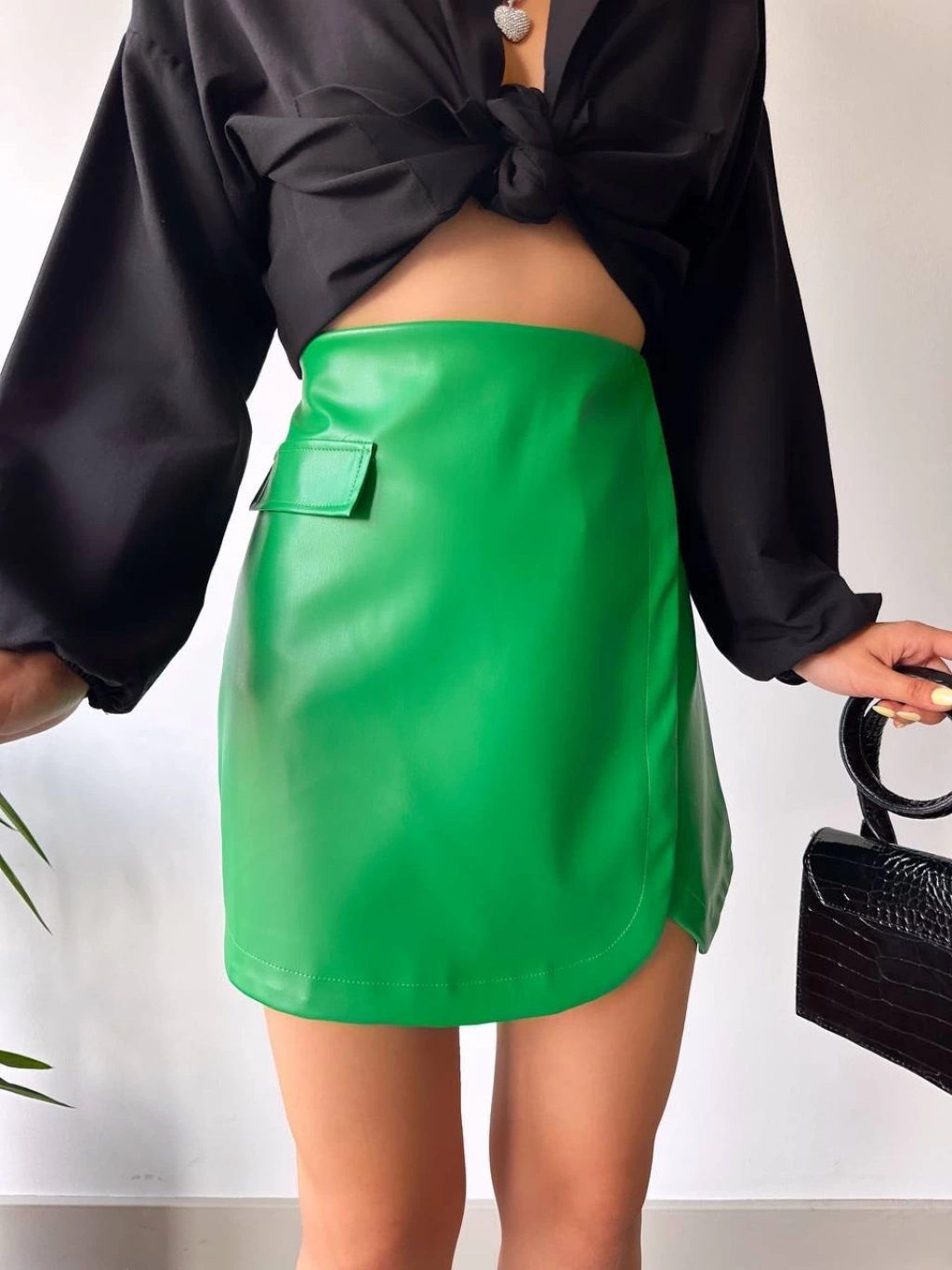 Cep detaylı oval kapaklı deri etek yeşil h240048