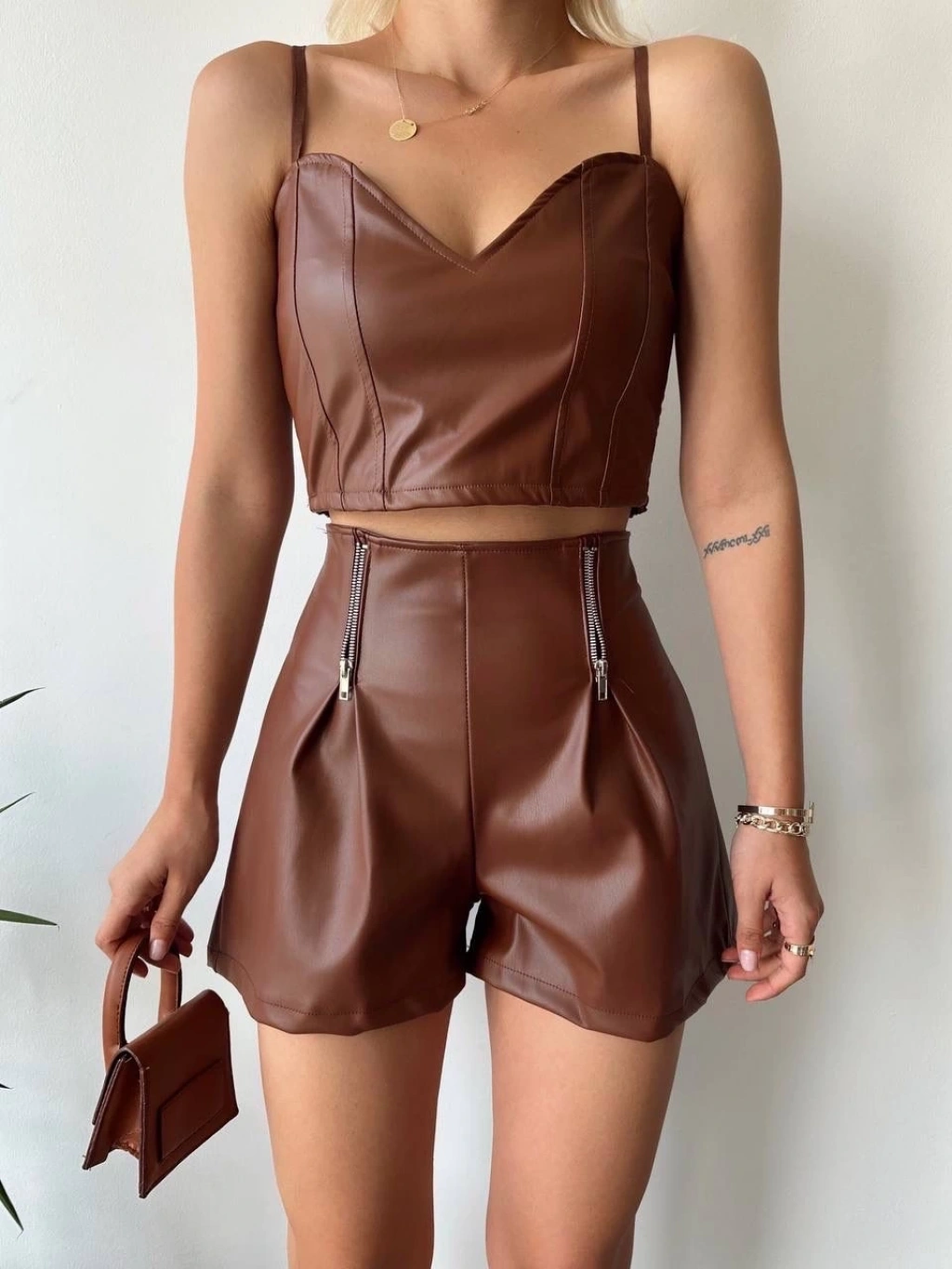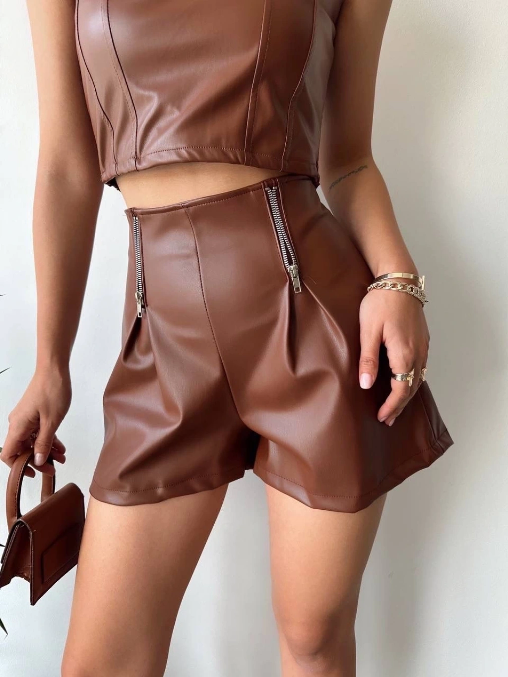 Çift fermuarlı deri şort kahve h24394