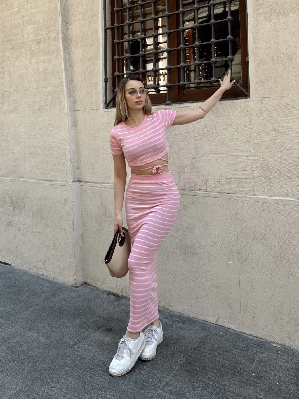Çizgili etekli takım pembe s3609