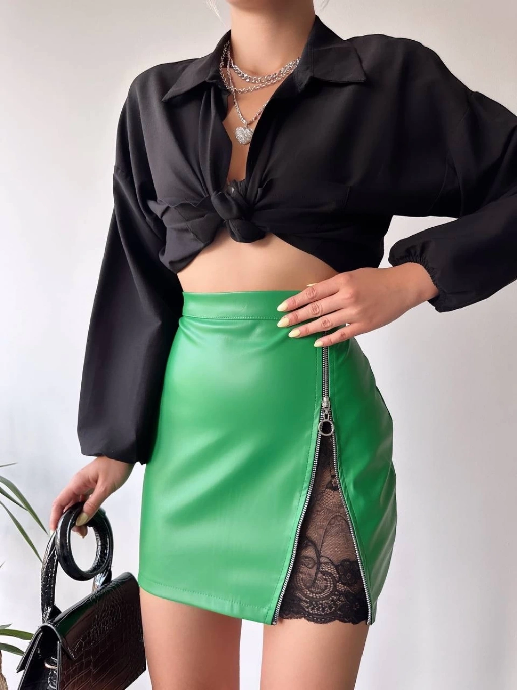 Dantelli fermuarlı deri etek yeşil w24598