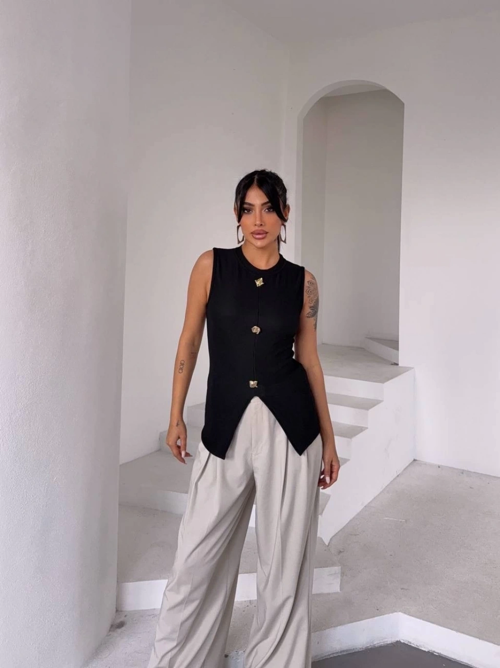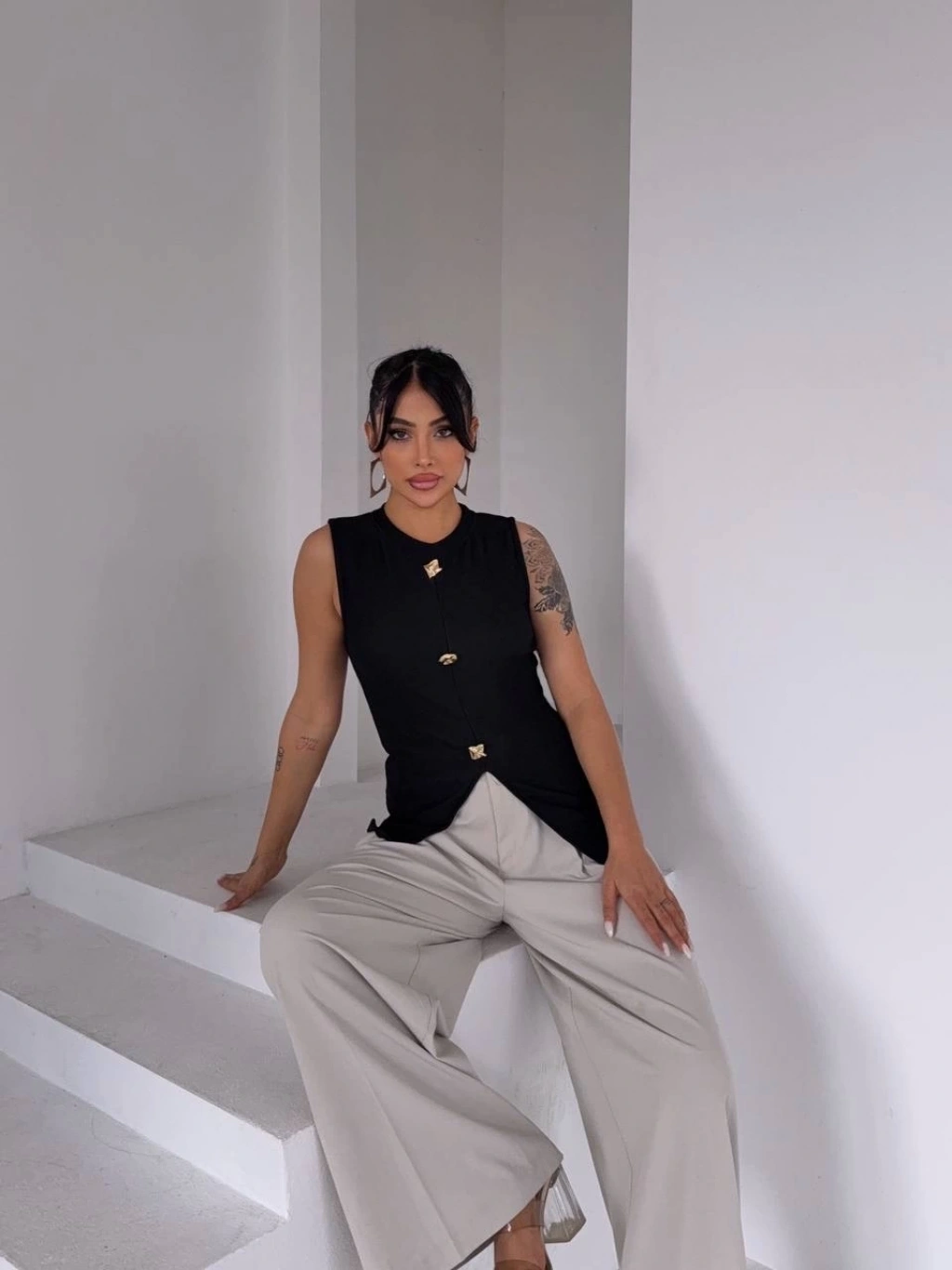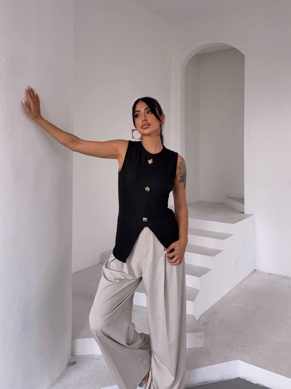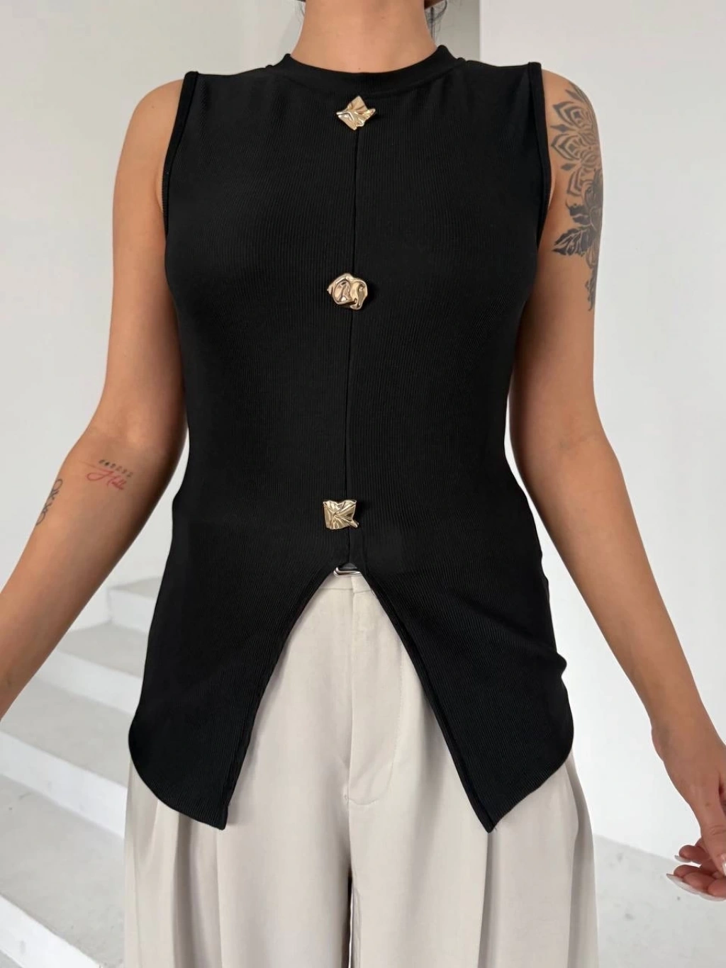 Kadın siyah bisiklet yaka gold düğmeli ottoman bluz s2310
