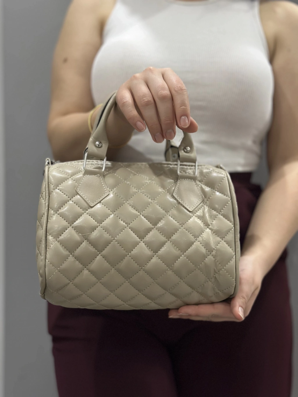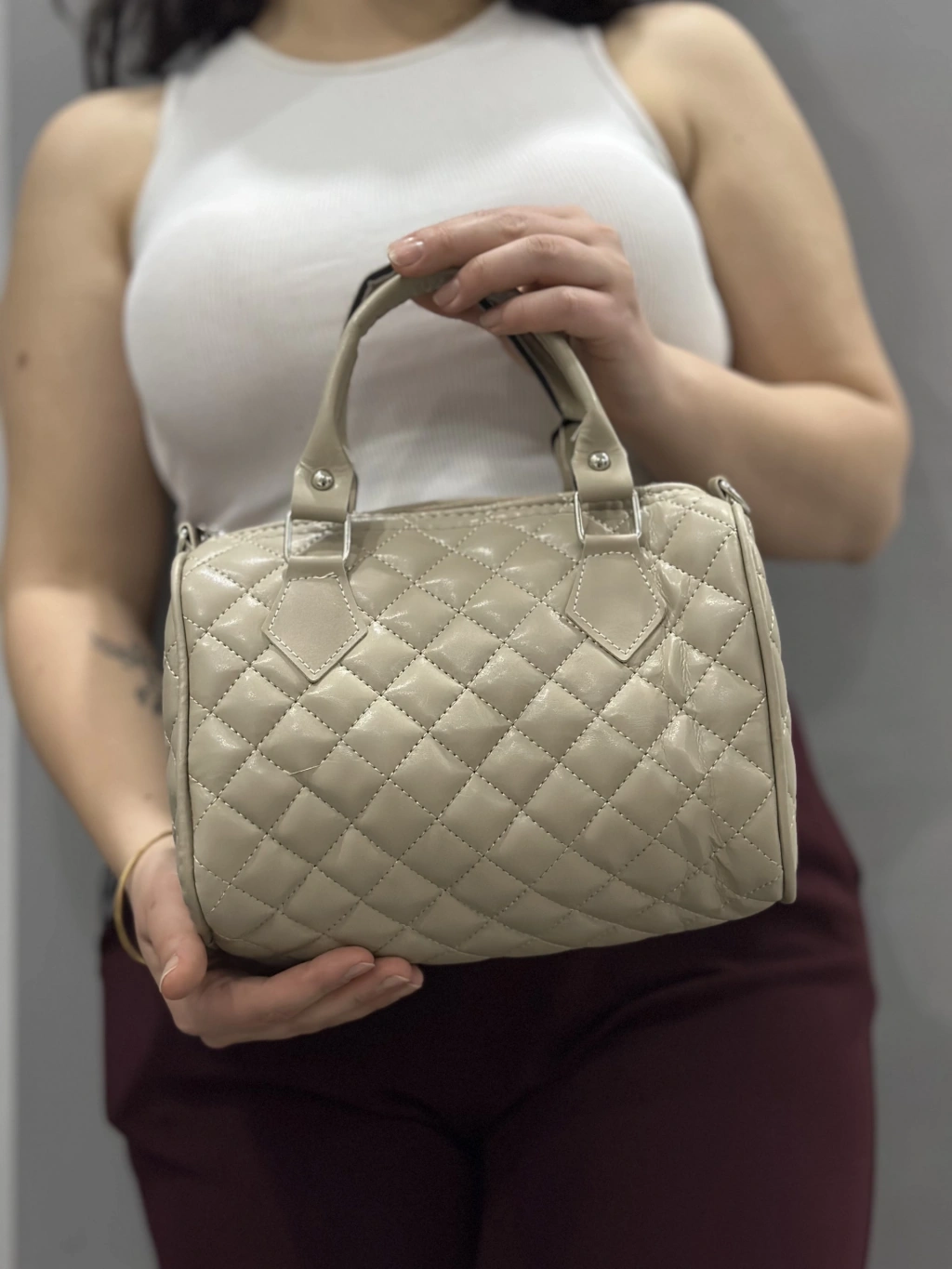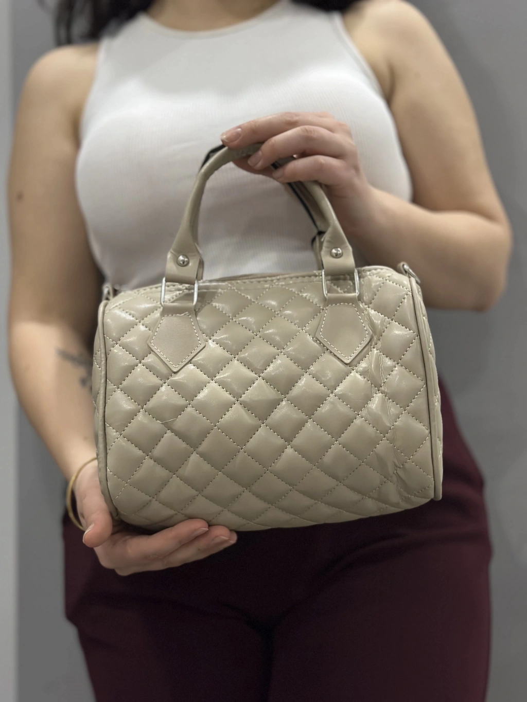 Kapaksız kapitone bej cilt çanta