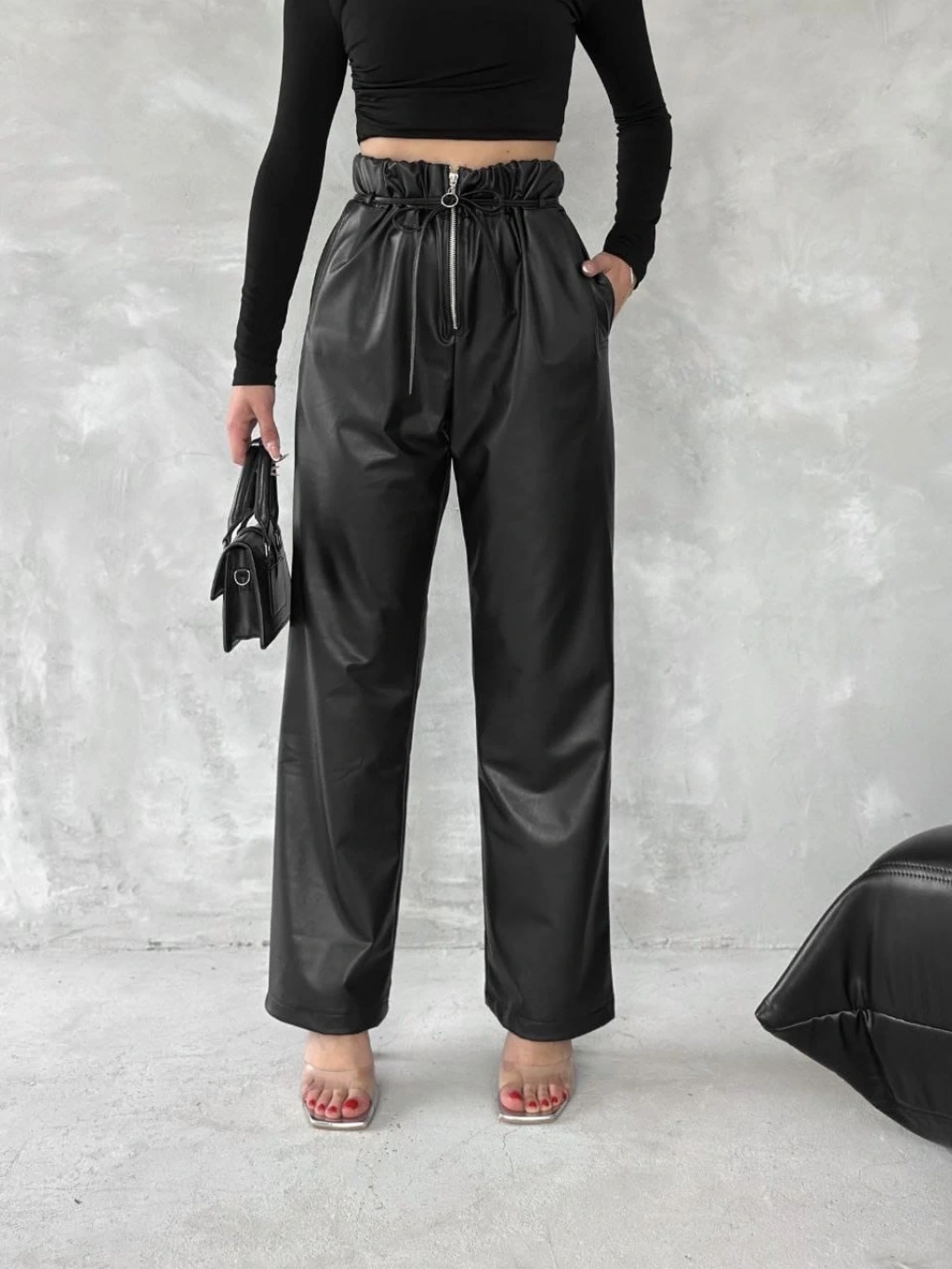 Kendinden ince kemerli deri pantolon siyah t1178